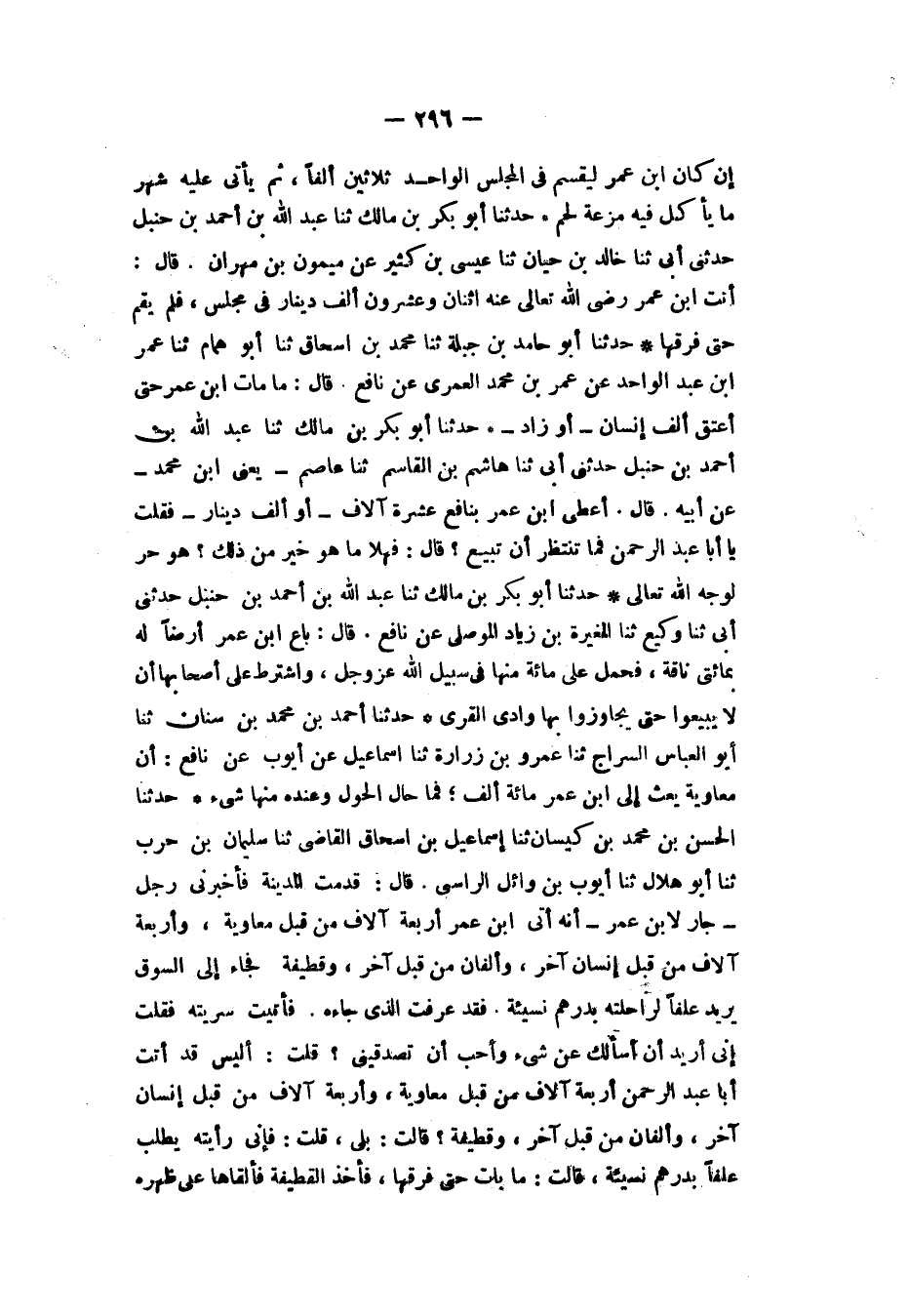 حَدَّثَنَا أَحْمَدُ بْنُ مُحَمَّدِ بْنِ سِنَانٍ، ثَنَا أَبُو الْعَبَّاسِ السَّرَّاجُ، ثَنَا عَمْرُو بْنُ زُرَارَةَ، ثَنَا إِسْمَاعِيلُ، عَنْ أَيُّوبَ، عَنْ نَافِعٍ: أَنَّ مُعَاوِيَةَ بَعَثَ إِلَى ابْنِ عُمَرَ مِائَةَ أَلْفٍ، فَمَا حَالَ الْحَوْلُ وَعِنْدَهُ مِنْهَا شَيْءٌ.