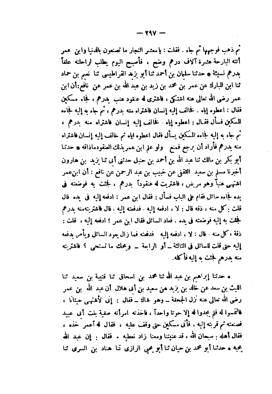 حَدَّثَنَا سُلَيْمَانُ بْنُ أَحْمَدَ، ثَنَا أَبُو يَزِيدَ الْقَرَاطِيسِيُّ، ثَنَا نُعَيْمُ بْنُ حَمَّادٍ، ثَنَا ابْنُ الْمُبَارَكِ، عَنْ عُمَرَ بْنِ مُحَمَّدِ بْنِ زَيْدِ بْنِ عَبْدِ اللَّهِ بْنِ عُمَرَ، عَنْ نَافِعٍ: أَنَّ ابْنَ عُمَرَ رَضِيَ اللَّهُ تَعَالَى عَنْهُ اشْتَكَى، فَاشْتُرِي لَهُ عُنْقُودُ عِنَبٍ بِدِرْهَمٍ، فَجَاءَ مِسْكِينٌ، فَقَالَ: أَعْطُوهُ إِيَّاهُ، فَخَالَفَ إِلَيْهِ إِنْسَانٌ فَاشْتَرَاهُ مِنْهُ بِدِرْهَمٍ، ثُمَّ جَاءَ بِهِ إِلَيْهِ فَجَاءَهُ الْمِسْكِينُ فَسَأَلَ، فَقَالَ: أَعْطُوهُ إِيَّاهُ، فَخَالَفَ إِلَيْهِ إِنْسَانٌ فَاشْتَرَاهُ مِنْهُ بِدِرْهَمٍ، ثُمَّ جَاءَ بِهِ إِلَيْهِ فَجَاءَهُ الْمِسْكِينُ يَسْأَلُ، فَقَالَ: أَعْطُوهُ إِيَّاهُ، ثُمَّ خَالَفَ إِلَيْهِ إِنْسَانٌ فَاشْتَرَاهُ مِنْهُ بِدِرْهَمٍ فَأَرَادَ أَنْ يَرْجِعَ فَمُنِعَ وَلَوْ عَلِمَ ابْنُ عُمَرَ بِذَلِكَ الْعُنْقُودِ مَا ذَاقَهُ.