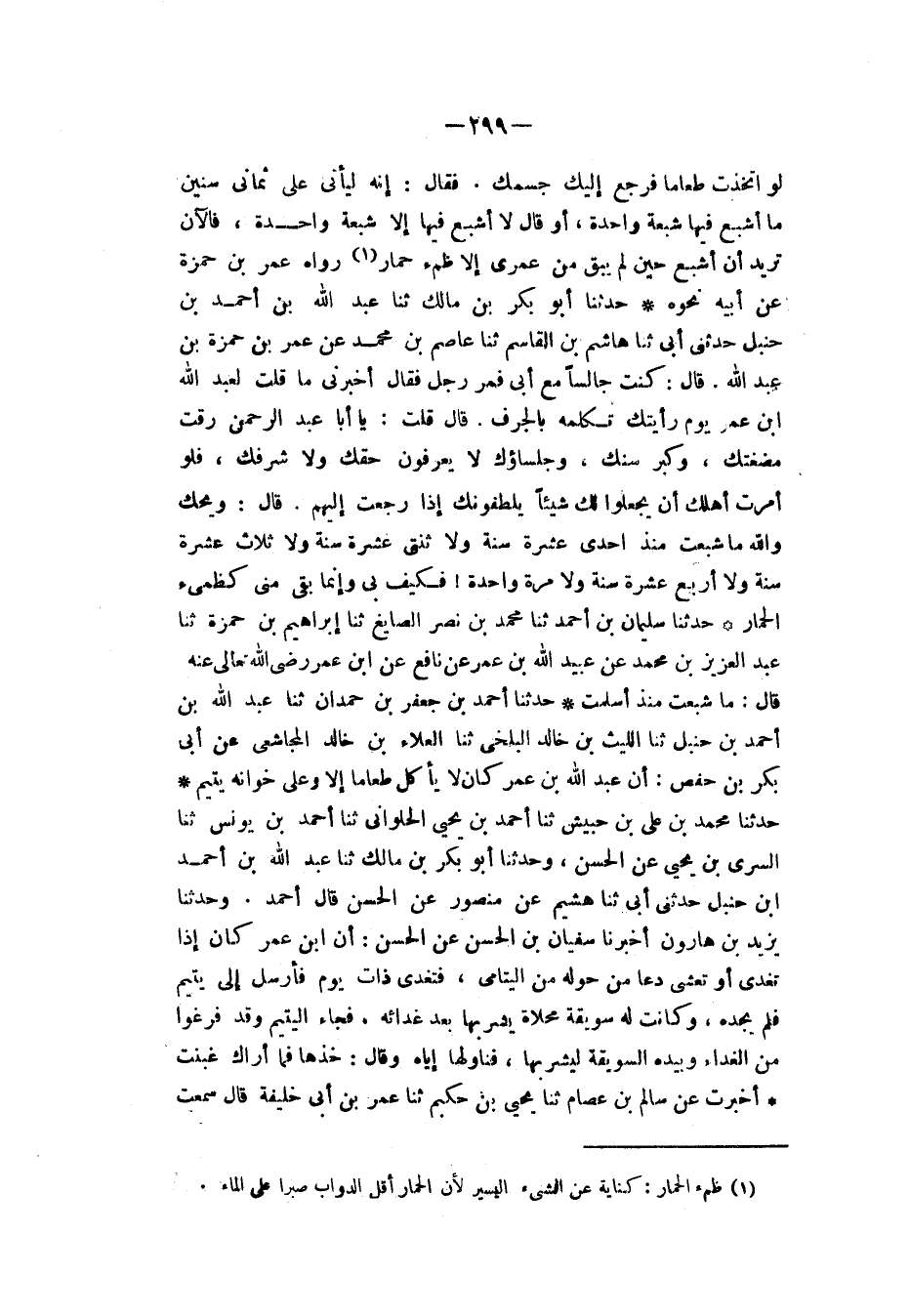 حَدَّثَنَا أَبُو بَكْرِ بْنُ مَالِكٍ، ثَنَا عَبْدُ اللَّهِ بْنُ أَحْمَدَ بْنِ حَنْبَلٍ، حَدَّثَنِي أَبِي، ثَنَا هَاشِمُ بْنُ الْقَاسِمِ، ثَنَا عَاصِمُ بْنُ مُحَمَّدٍ، عَنْ عُمَرَ بْنِ حَمْزَةَ بْنِ عَبْدِ اللَّهِ، قَالَ: كُنْتُ مَعَ أَبِي فَمَرَّ رَجُلٌ، فَقَالَ: أَخْبِرْنِي مَا قُلْتَ لِعَبْدِ اللَّهِ بْنِ عُمَرَ يَوْمَ رَأَيْتُكَ تُكَلِّمُهُ بِالْجُرْفِ، قَالَ: قُلْتُ: يَا أَبَا عَبْدِ الرَّحْمَنِ رَقَّتْ مُضْغَتُكَ، وَكَبُرَ سِنُّكَ، وَجُلَسَاؤُكَ لَا يَعْرِفُونَ حَقَّكَ وَلَا شَرَفَكَ، فَلَوْ أَمَرْتَ أَهْلَكَ أَنْ يَجْعَلُوا لَكَ شَيْئًا يُلْطِفُونَكَ إِذَا رَجَعْتَ إِلَيْهِمْ، قَالَ: وَيْحَكَ، وَاللَّهِ مَا شَبِعْتُ مُنْذُ إِحْدَى عَشْرَةَ سَنَةً وَلَا ثِنْتَيْ عَشْرَةَ سَنَةً وَلَا ثَلَاثَ عَشْرَةَ سَنَةً وَلَا أَرْبَعَ عَشْرَةَ سَنَةً وَلَا مَرَّةً وَاحِدَةً، فَكَيْفَ بِي وَإِنَّمَا بَقِيَ مِنِّي كَظَمَأِ الْحِمَارِ؟.