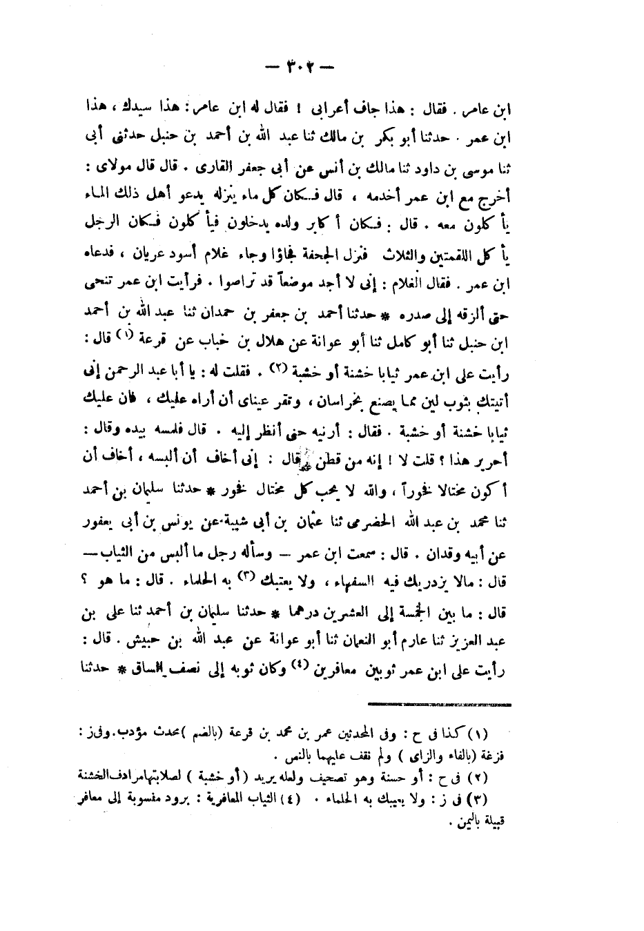 حَدَّثَنَا أَحْمَدُ بْنُ جَعْفَرِ بْنِ حَمْدَانَ، ثَنَا عَبْدُ اللَّهِ بْنُ أَحْمَدَ بْنِ حَنْبَلٍ، ثَنَا أَبُو كَامِلٍ، ثَنَا أَبُو عَوَانَةَ، عَنْ هِلَالِ بْنِ خَبَّابٍ، عَنْ قَزَعَةَ، قَالَ: رَأَيْتُ عَلَى ابْنِ عُمَرَ ثِيَابًا خَشِنَةً، أَوْ خَشِبَةً، فَقُلْتُ لَهُ: يَا أَبَا عَبْدِ الرَّحْمَنِ إِنِّي أَتَيْتُكَ بِثَوْبٍ لَيِّنٍ مِمَّا يُصْنَعُ بِخُرَاسَانَ، وَتَقَرُّ عَيْنَايَ أَنْ أَرَاهُ عَلَيْكَ، فَإِنَّ عَلَيْكَ ثِيَابًا خَشِنَةً، أَوْ خَشِبَةً، فَقَالَ: أَرِنِيهِ حَتَّى أَنْظُرَ إِلَيْهِ، قَالَ: فَلَمَسَهُ بِيَدِهِ، وَقَالَ: أَحَرِيرٌ هَذَا؟ قُلْتُ: لَا، إِنَّهُ مِنْ قُطْنٍ، قَالَ: إِنِّي أَخَافُ أَنْ أَلْبَسَهُ، أَخَافُ أَنْ أَكُونَ مُخْتَالًا فَخُورًا، وَاللَّهُ لَا يُحِبُّ كُلَّ مُخْتَالٍ فَخُورٍ.