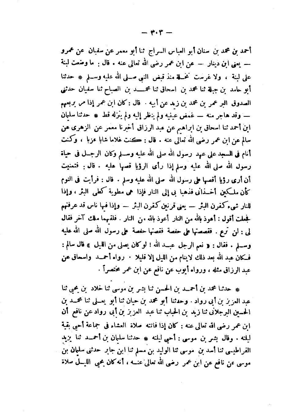 حَدَّثَنَا مُحَمَّدُ بْنُ أَحْمَدَ بْنِ الْحَسَنِ، ثَنَا بِشْرُ بْنُ مُوسَى، ثَنَا خَلَّادُ بْنُ يَحْيَى، ثَنَا عَبْدُ الْعَزِيزِ بْنُ أَبِي رَوَّادٍ، وَحَدَّثَنَا أَبُو مُحَمَّدِ بْنُ حَيَّانَ، ثَنَا أَبُو يَعْلَى، ثَنَا مُحَمَّدُ بْنُ الْحُسَيْنِ الْبُرْجُلَانِيُّ، ثَنَا زَيْدُ بْنُ الْحُبَابِ، ثَنَا عَبْدُ الْعَزِيزِ بْنُ أَبِي رَوَّادٍ، عَنْ نَافِعٍ: أَنَّ ابْنَ عُمَرَ رَضِيَ اللَّهُ تَعَالَى عَنْهُ كَانَ إِذَا فَاتَتْهُ صَلَاةُ الْعِشَاءِ فِي جَمَاعَةٍ أَحْيَا بَقِيَّةَ لَيْلَتِهِ، وَقَالَ بِشْرُ بْنُ مُوسَى: أَحْيَا لَيْلَتَهُ.