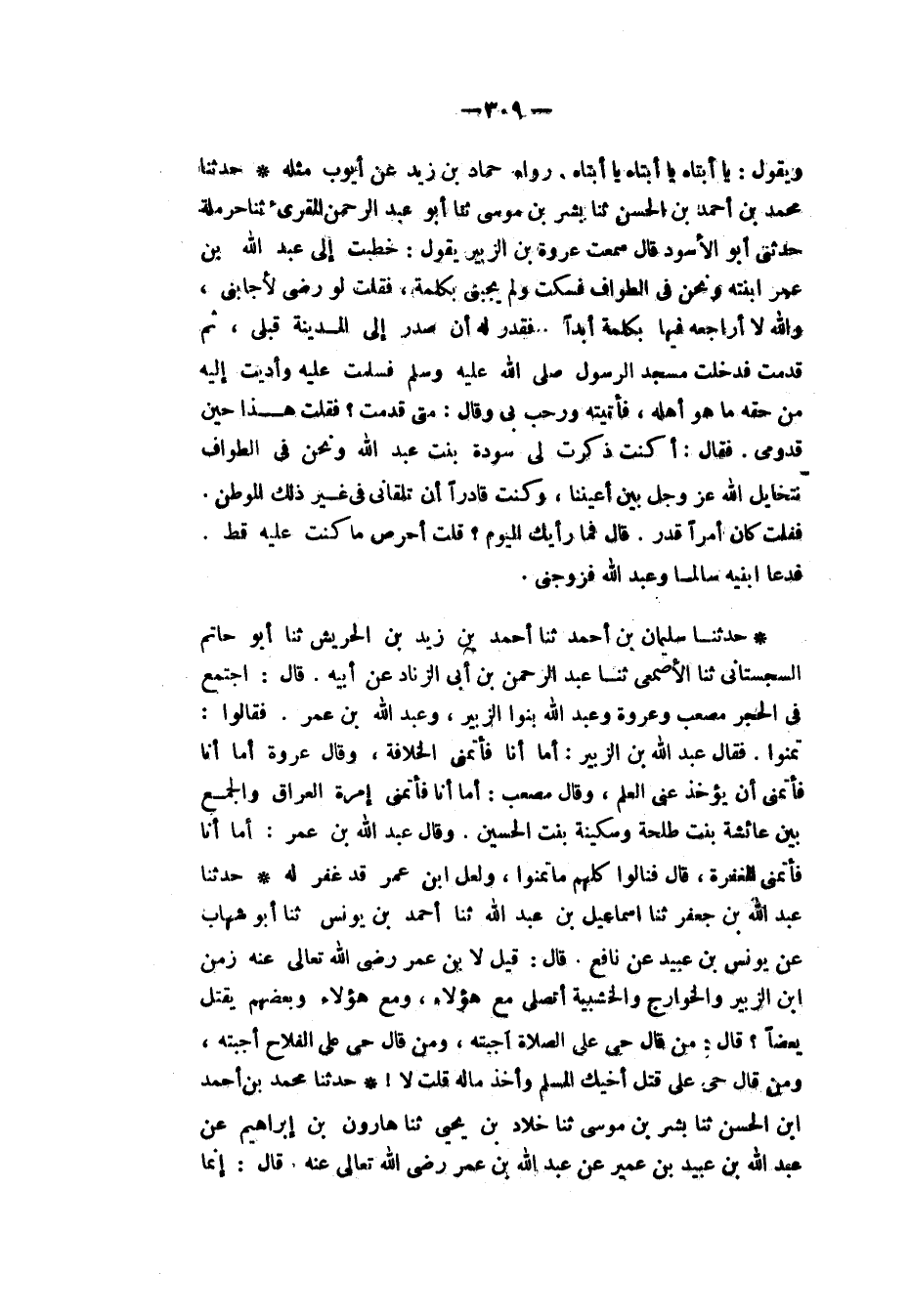 حَدَّثَنَا مُحَمَّدُ بْنُ أَحْمَدَ بْنِ الْحَسَنِ، ثَنَا بِشْرُ بْنُ مُوسَى، ثَنَا خَلَّادُ بْنُ يَحْيَى، ثَنَا هَارُونُ بْنُ إِبْرَاهِيمَ، عَنْ عَبْدِ اللهِ بْنِ عُمَيْرٍ، عَنْ عَبْدِ اللهِ بْنِ عُمَرَ، رَضِيَ اللهُ تَعَالَى عَنْهُ قَالَ: «إِنَّمَا -[310]- كَانَ §مَثَلُنَا فِي هَذِهِ الْفِتْنَةِ كَمَثَلِ قَوْمٍ كَانُوا يَسِيرُونَ عَلَى جَادَّةٍ يَعْرِفُونَهَا، فَبَيْنَمَا هُمْ كَذَلِكَ إِذْ غَشِيَتْهُمْ سَحَابَةٌ وَظُلْمَةٌ، فَأَخَذَ بَعْضُهُمْ يَمِينًا وَشِمَالًا فَأَخْطَأَ الطَّرِيقَ، وَأَقَمْنَا حَيْثُ أَدْرَكَنَا ذَلِكَ حَتَّى جَلَّى اللهُ ذَلِكَ عَنَّا فَأَبْصَرْنَا طَرِيقَنَا الْأَوَّلَ فَعَرَفْنَا وَأَخَذْنَا فِيهِ، وَإِنَّمَا هَؤُلَاءِ فِتْيَانُ قُرَيْشٍ يَقْتَتِلُونَ عَلَى هَذَا السُّلْطَانِ وَعَلَى هَذِهِ الدُّنْيَا، مَا أُبَالِي أَنْ لَا يَكُونَ لِي مَا يُفَتِّلُ بَعْضُهُمْ بَعْضًا بِنَعْلَيَّ هَاتَيْنِ الْجَرْدَاوَيْنِ»