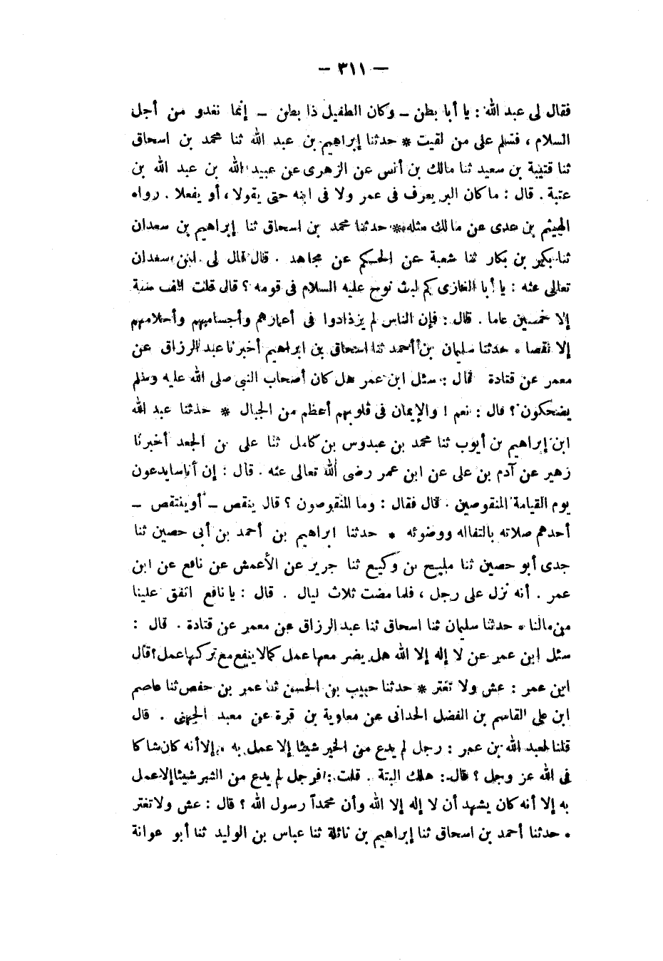 حَدَّثَنَا إِبْرَاهِيمُ بْنُ عَبْدِ اللهِ، ثَنَا مُحَمَّدُ بْنُ إِسْحَاقَ، ثَنَا قُتَيْبَةُ بْنُ سَعِيدٍ، ثَنَا مَالِكُ بْنُ أَنَسٍ، عَنِ الزُّهْرِيِّ، عَنْ عُبَيْدِ اللهِ بْنِ عَبْدِ اللهِ بْنِ عُتْبَةَ، قَالَ: «مَا كَانَ §الْبِرُّ يُعْرَفُ فِي عُمَرَ، وَلَا فِي ابْنِهِ، حَتَّى يَقُولَا أَوْ يَفْعَلَا» رَوَاهُ الْهَيْثَمُ بْنُ عَدِيٍّ، عَنْ مَالِكٍ، مِثْلَهُ