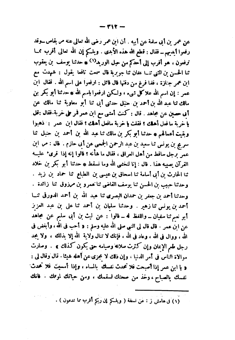 حَدَّثَنَا أَبُو بَكْرِ بْنُ خَلَّادٍ، ثَنَا الْحَارِثُ بْنُ أَبِي أُسَامَةَ، ثَنَا إِسْحَاقُ بْنُ عِيسَى بْنِ الطَّبَّاعِ، ثَنَا حَمَّادُ بْنُ زَيْدٍ، وَحَدَّثَنَا حَبِيبُ بْنُ الْحَسَنِ، ثَنَا يُوسُفُ الْقَاضِي، ثَنَا عَمْرُو بْنُ مَرْزُوقٍ، ثَنَا زَائِدَةُ، وَحَدَّثَنَا أَحْمَدُ بْنُ جَعْفَرِ بْنِ حَمْدَانَ الْبَصْرِيُّ، ثَنَا عَبْدُ اللهِ بْنُ أَحْمَدَ الدَّوْرَقِيُّ، ثَنَا أَحْمَدُ بْنُ يُونُسَ، ثَنَا زُهَيْرٌ، وَحَدَّثَنَا سُلَيْمَانُ بْنُ أَحْمَدَ، ثَنَا عَلِيُّ بْنُ عَبْدِ الْعَزِيزِ، ثَنَا أَبُو نُعَيْمٍ، ثَنَا سُفْيَانُ، وَاللَّفْظُ لَهُ، قَالُوا: عَنْ لَيْثِ بْنِ أَبِي سُلَيْمٍ، عَنْ مُجَاهِدٍ، عَنِ ابْنِ عُمَرَ، قَالَ: قَالَ لِيَ النَّبِيُّ صَلَّى اللهُ عَلَيْهِ وَسَلَّمَ: «§أَحِبَّ فِي اللهِ، وَأَبْغِضْ فِي اللهِ، وَوَالِ فِي اللهِ، وَعَادِ فِي اللهِ، فَإِنَّكَ لَا تَنَالُ وِلَايَةَ اللهِ إِلَّا بِذَلِكَ، وَلَا يَجِدُ رَجُلٌ طَعْمَ الْإِيمَانِ، وَإِنْ كَثُرَتْ صَلَاتُهُ وَصِيَامُهُ، حَتَّى يَكُونَ كَذَلِكَ»، وَصَارَتْ مُوَالَاةُ النَّاسِ فِي أَمْرِ الدُّنْيَا، وَإِنَّ ذَلِكَ لَا يَجْزِي عَنْ أَهْلِهِ شَيْئًا "