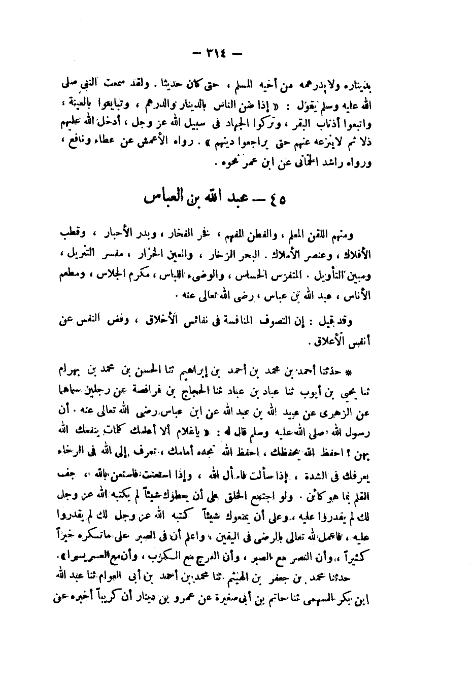 §عَبْدُ اللهِ بْنُ الْعَبَّاسِ وَمِنْهُمُ اللَّقِنُ الْمُعَلَّمُ، وَالْفَطِنُ الْمُفَهَّمُ، فَخْرُ الْفُخَّارِ، وَبَدْرُ الْأَحْبَارِ، وَقُطْبُ الْأَفْلَاكِ، وَعُنْصُرُ الْأَمْلَاكِ، وَقُطْبُ الْأَفْلَاكِ، وَعُنْصُرُ الْأَمْلَاكِ، الْبَحْرُ الزَّخَّارُ، وَالْعَيْنُ الْخَرَّارُ، مُفَسِّرُ التَّنْزِيلِ، وَمُبَيِّنُ التَّأْوِيلِ، الْمُتَفَرِّسُ الْحَسَّاسُ، وَالْوَضِيءُ اللَّبَّاسُ، مُكْرِمُ الْجُلَّاسِ، وَمُطْعِمُ الْأُنَاسِ، عَبْدُ اللهِ بْنُ عَبَّاسٍ، رَضِيَ اللهُ تَعَالَى عَنْهُ، وَقَدْ قِيلَ: «إِنَّ التَّصَوُّفَ الْمُنَافَسَةُ فِي نَفَائِسِ الْأَخْلَاقِ، وَفَضُّ النَّفْسِ عَنْ أَنْفَسِ الْأَعْلَاقِ»
