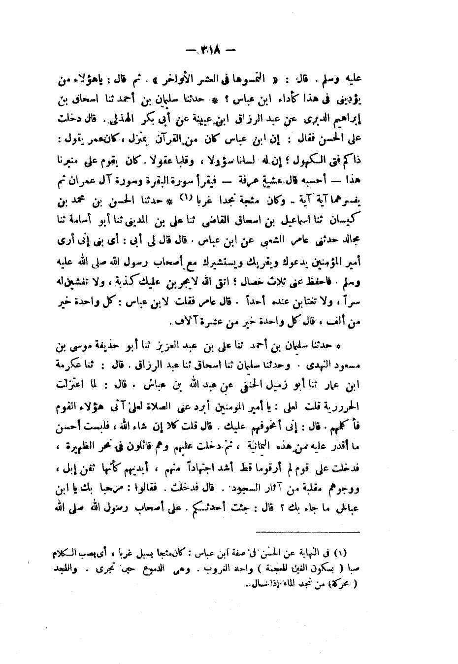 حَدَّثَنَا سُلَيْمَانُ بْنُ أَحْمَدَ، ثَنَا عَلِيُّ بْنُ عَبْدِ الْعَزِيزِ، ثَنَا أَبُو حُذَيْفَةَ مُوسَى بْنُ مَسْعُودٍ النَّهْدِيُّ. وَحَدَّثَنَا سُلَيْمَانُ، ثَنَا إِسْحَاقُ، ثَنَا عَبْدُ الرَّزَّاقِ، قَالَ: ثَنَا عِكْرِمَةُ بْنُ عَمَّارٍ، ثَنَا أَبُو زُمَيْلٍ الْحَنَفِيُّ، عَنْ عَبْدِ اللهِ بْنِ عَبَّاسٍ، قَالَ: لَمَّا اعْتَزَلْتُ الْحَرُورِيَّةَ قُلْتُ لِعَلِيٍّ: يَا أَمِيرَ الْمُؤْمِنِينَ، أَبْرِدْ عَنِّي الصَّلَاةِ لَعَلِّي آتِي هَؤُلَاءِ الْقَوْمَ فَأُكَلِّمَهُمْ، قَالَ: إِنِّي أَتَخَوَّفُهُمْ عَلَيْكَ، قَالَ: قُلْتُ: كَلَّا إِنْ شَاءَ اللهُ، فَلَبِسْتُ أَحْسَنَ مَا أَقْدِرُ عَلَيْهِ مِنْ هَذِهِ الْيَمَانِيَةِ، ثُمَّ دَخَلْتُ عَلَيْهِمْ وَهُمْ قَائِلُونَ فِي نَحْرِ الظَّهِيرَةِ، فَدَخَلْتُ عَلَى قَوْمٍ فَلَمْ أَرَ قَوْمًا قَطُّ أَشَدَّ اجْتِهَادًا مِنْهُمْ، أَيْدِيهِمْ كَأَنَّهَا ثَفِنُ إِبِلٍ، وَوُجُوهُهُمْ مُقَلَّبَةٌ مِنْ آثَارِ السُّجُودِ، قَالَ: فَدَخَلْتُ فَقَالُوا: مَرْحَبًا بِكَ يَا ابْنَ عَبَّاسٍ، مَا جَاءَ بِكَ؟ قَالَ: جِئْتُ أُحَدِّثُكُمْ، عَلَى أَصْحَابِ رَسُولِ اللهِ صَلَّى اللهُ عَلَيْهِ وَسَلَّمَ -[319]- نَزَلَ الْوَحْيُ، وَهُمْ أَعْلَمُ بِتَأْوِيلِهِ، فَقَالَ بَعْضُهُمْ: لَا تُحَدِّثُوهُ، وَقَالَ بَعْضُهُمْ: لَنُحَدِّثَنَّهُ، قَالَ: قُلْتُ: أَخْبِرُونِي مَا تَنْقِمُونَ عَلَى ابْنِ عَمِّ رَسُولِ اللهِ صَلَّى اللهُ عَلَيْهِ وَسَلَّمَ وَخَتَنِهِ وَأَوَّلِ مَنْ آمَنَ بِهِ، وَأَصْحَابُ رَسُولِ اللهِ مَعَهُ؟ قَالُوا: نَنْقِمُ عَلَيْهِ ثَلَاثًا، قُلْتُ: وَمَا هُنَّ؟ قَالُوا: أُولَاهُنَّ أَنَّهُ حَكَّمَ الرِّجَالَ فِي دِينِ اللهِ وَقَدْ قَالَ اللهُ عَزَّ وَجَلَّ: {إِنِ الْحُكْمُ إِلَّا لِلَّهِ} [الأنعام: 57]، قَالَ: قُلْتُ: وَمَاذَا؟ قَالُوا: قَاتَلَ وَلَمْ يَسْبِ وَلَمْ يَغْنَمْ، لَئِنْ كَانُوا كُفَّارًا لَقَدْ حَلَّتْ لَهُ أَمْوَالُهُمْ، وَإِنْ كَانُوا مُؤْمِنِينَ لَقَدْ حُرِّمَتْ عَلَيْهِ دِمَاؤُهُمْ، قَالَ: قُلْتُ: وَمَاذَا؟ قَالُوا: وَمَحَا نَفْسَهُ عَنْ أَمِيرِ الْمُؤْمِنِينَ، فَإِنْ لَمْ يَكُنْ أَمِيرَ الْمُؤْمِنِينَ فَهُوَ أَمِيرُ الْكَافِرِينَ، قَالَ: قُلْتُ: أَرَأَيْتُمْ إِنْ قَرَأْتُ عَلَيْكُمْ مِنْ كِتَابِ اللهِ الْمُحْكَمِ، وَحَدَّثْتُكُمْ مِنْ سُنَّةِ نَبِيِّكُمْ صَلَّى اللهُ عَلَيْهِ وَسَلَّمَ، مَا لَا تُنْكِرُونَ أَتَرْجَعُونَ؟ قَالُوا: نَعَمْ، قَالَ: قُلْتُ: أَمَّا قَوْلُكُمْ: إِنَّهُ حَكَّمَ الرِّجَالَ فِي دِينِ اللهِ، فَإِنَّهُ يَقُولُ: {يَا أَيُّهَا الَّذِينَ آمَنُوا لَا تَقْتُلُوا الصَّيْدَ وَأَنْتُمْ حُرُمٌ، وَمَنْ قَتَلَهُ مِنْكُمْ مُتَعَمِّدًا فَجَزَاءٌ} [المائدة: 95] إِلَى قَوْلِهِ: {يَحْكُمُ بِهِ ذَوَا عَدْلٍ مِنْكُمْ} [المائدة: 95]، وَقَالَ فِي الْمَرْأَةِ وَزَوْجِهَا: {وَإِنْ خِفْتُمْ شِقَاقَ بَيْنِهِمَا فَابْعَثُوا حَكَمًا مِنْ أَهْلِهِ وَحَكَمًا مِنْ أَهْلِهَا} [النساء: 35]، أَنْشُدُكُمُ اللهَ أَفَحُكْمُ الرِّجَالِ فِي حَقْنِ دِمَائِهِمْ وَأَنْفُسِهِمْ وَصَلَاحِ ذَاتِ بَيْنِهِمْ أَحَقُّ أَمْ فِي أَرْنَبٍ ثَمَنُهَا رُبْعُ دِرْهَمٍ؟ فَقَالُوا: اللهُمَّ فِي حَقْنِ دِمَائِهِمْ، وَصَلَاحِ ذَاتِ بَيْنِهِمْ، قَالَ: أَخَرَجْتُ مِنْ هَذِهِ؟ قَالُوا: اللهُمَّ نَعَمْ. قَالَ: وَأَمَّا قَوْلُكُمْ: إِنَّهُ قَاتَلَ وَلَمْ يَسْبِ وَلَمْ يَغْنَمْ، أَتَسْبُونَ أُمَّكُمْ، ثُمَّ تَسْتَحِلُّونَ مِنْهَا مَا تَسْتَحِلُّونَ مِنْ غَيْرِهَا، فَقَدْ كَفَرْتُمْ، وَإِنْ زَعَمْتُمْ أَنَّهَا لَيْسَتْ بِأُمِّكُمْ فَقَدْ كَفَرْتُمْ وَخَرَجْتُمْ مِنَ الْإِسْلَامِ، إِنَّ اللهَ عَزَّ وَجَلَّ يَقُولُ: {النَّبِيُّ أَوْلَى بِالْمُؤْمِنِينَ مِنْ أَنْفُسِهِمْ وَ