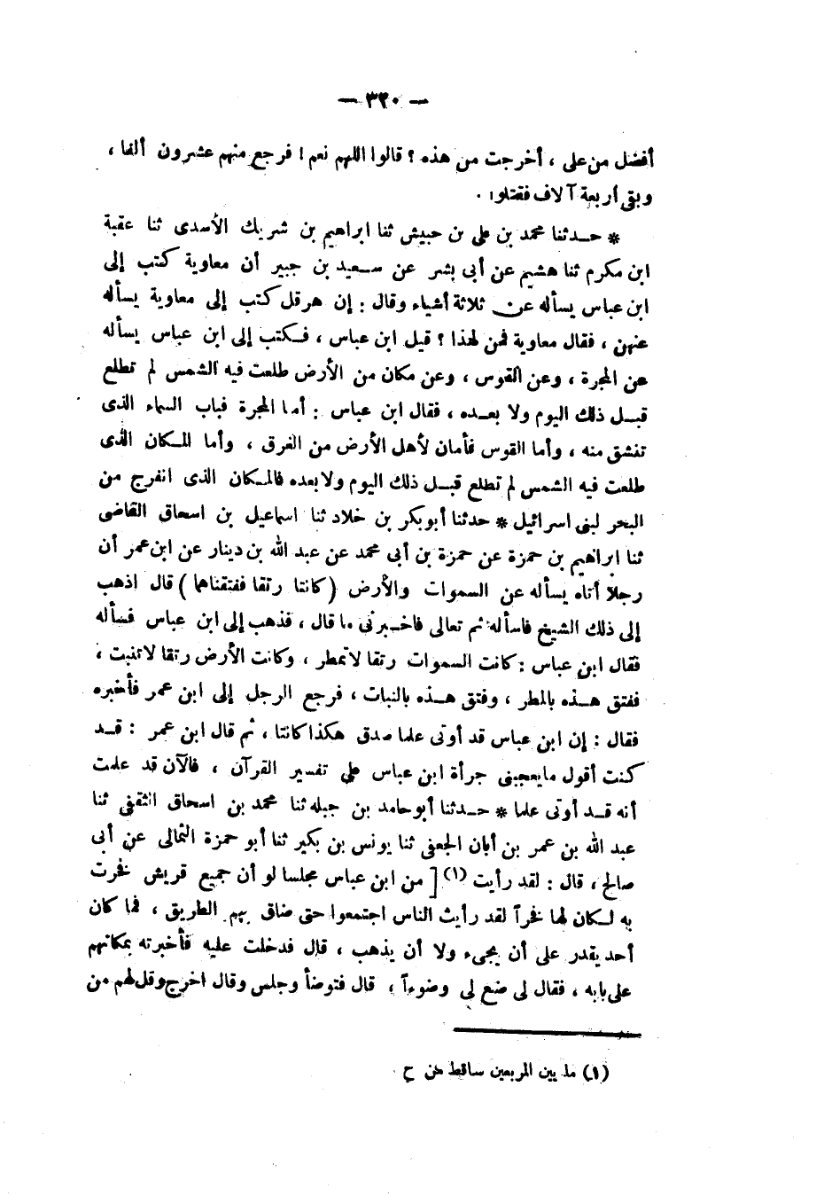 حَدَّثَنَا مُحَمَّدُ بْنُ عَلِيِّ بْنِ حُبَيْشٍ، ثنا إِبْرَاهِيمُ بْنُ شَرِيكٍ الْأَسَدِيُّ، ثنا عُقْبَةُ بْنُ مُكْرَمٍ، ثنا هُشَيْمٌ، عَنْ أَبِي بِشْرٍ، عَنْ سَعِيدِ بْنِ جُبَيْرٍ، أَنَّ مُعَاوِيَةَ، كَتَبَ إِلَى ابْنِ عَبَّاسٍ يَسْأَلُهُ عَنْ ثَلَاثَةِ، أَشْيَاءَ، وَقَالَ: إِنَّ هِرَقْلَ كَتَبَ إِلَى مُعَاوِيَةَ يَسْأَلُهُ عَنْهُنَّ، فَقَالَ مُعَاوِيَةُ: فَمَنْ لِهَذَا؟ قِيلَ: ابْنُ عَبَّاسٍ، فَكَتَبَ إِلَى ابْنِ عَبَّاسٍ يَسْأَلُهُ عَنِ الْمَجَرَّةِ، وَعَنِ الْقَوْسِ، وَعَنْ مَكَانٍ مِنَ الْأَرْضِ طَلَعَتْ فِيهِ الشَّمْسُ لَمْ تَطْلُعْ قَبْلَ ذَلِكَ الْيَوْمِ وَلَا بَعْدَهُ، فَقَالَ ابْنُ عَبَّاسٍ: «أَمَّا §الْمَجَرَّةُ فَبَابُ السَّمَاءِ الَّذِي تَنْشَقُّ مِنْهُ، وَأَمَّا الْقَوْسُ فَأَمَانٌ لِأَهْلِ الْأَرْضِ مِنَ الْغَرَقِ، وَأَمَّا الْمَكَانُ الَّذِي طَلَعَتْ عَلَيْهِ الشَّمْسُ لَمْ تَطْلُعْ قَبْلَ ذَلِكَ الْيَوْمِ وَلَا بَعْدَهُ فَالْمَكَانُ الَّذِي انْفَرَجَ مِنَ الْبَحْرِ لِبَنِي إِسْرَائِيلَ»