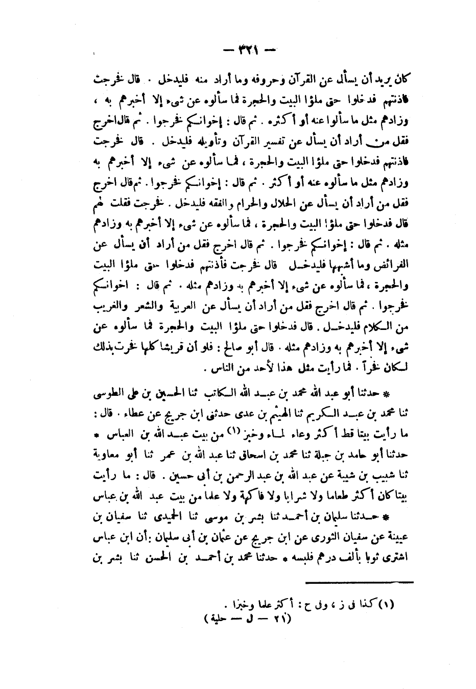 حَدَّثَنَا أَبُو عَبْدِ اللهِ مُحَمَّدُ بْنُ عَبْدِ اللهِ الْكَاتِبُ، ثَنَا الْحُسَيْنُ بْنُ عَلِيٍّ الطُّوسِيُّ، ثَنَا مُحَمَّدُ بْنُ عَبْدِ الْكَرِيمِ، ثَنَا الْهَيْثَمُ بْنُ عَدِيٍّ، حَدَّثَنِي ابْنُ جُرَيْجٍ، عَنْ عَطَاءٍ، قَالَ: «§مَا رَأَيْتُ بَيْتًا قَطُّ أَكْثَرَ وِعَاءً لِمَاءٍ وَخُبْزٍ مِنْ بَيْتِ عَبْدِ اللهِ بْنِ الْعَبَّاسِ»