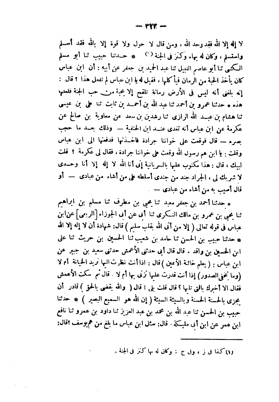 حَدَّثَنَا حَبِيبٌ، ثَنَا أَبُو مُسْلِمٍ الْكَشِّيُّ، ثَنَا أَبُو عَاصِمٍ النَّبِيلُ، ثَنَا عَبْدُ الْحَمِيدِ بْنُ جَعْفَرٍ، عَنْ أَبِيهِ، أَنَّ ابْنَ عَبَّاسٍ، كَانَ يَأْخُذُ الْحَبَّةَ مِنَ الرُّمَّانِ فَيَأْكُلُهَا، فَقِيلَ لَهُ: يَا ابْنَ عَبَّاسٍ لِمَ تَفْعَلُ هَذَا؟ قَالَ: إِنَّهُ بَلَغَنِي أَنَّهُ §لَيْسَ فِي الْأَرْضِ رُمَّانَةٌ تُلْقَحُ إِلَّا بِحَبَّةٍ مِنْ حَبِّ الْجَنَّةِ، فَلَعَلَّهَا هَذِهِ "