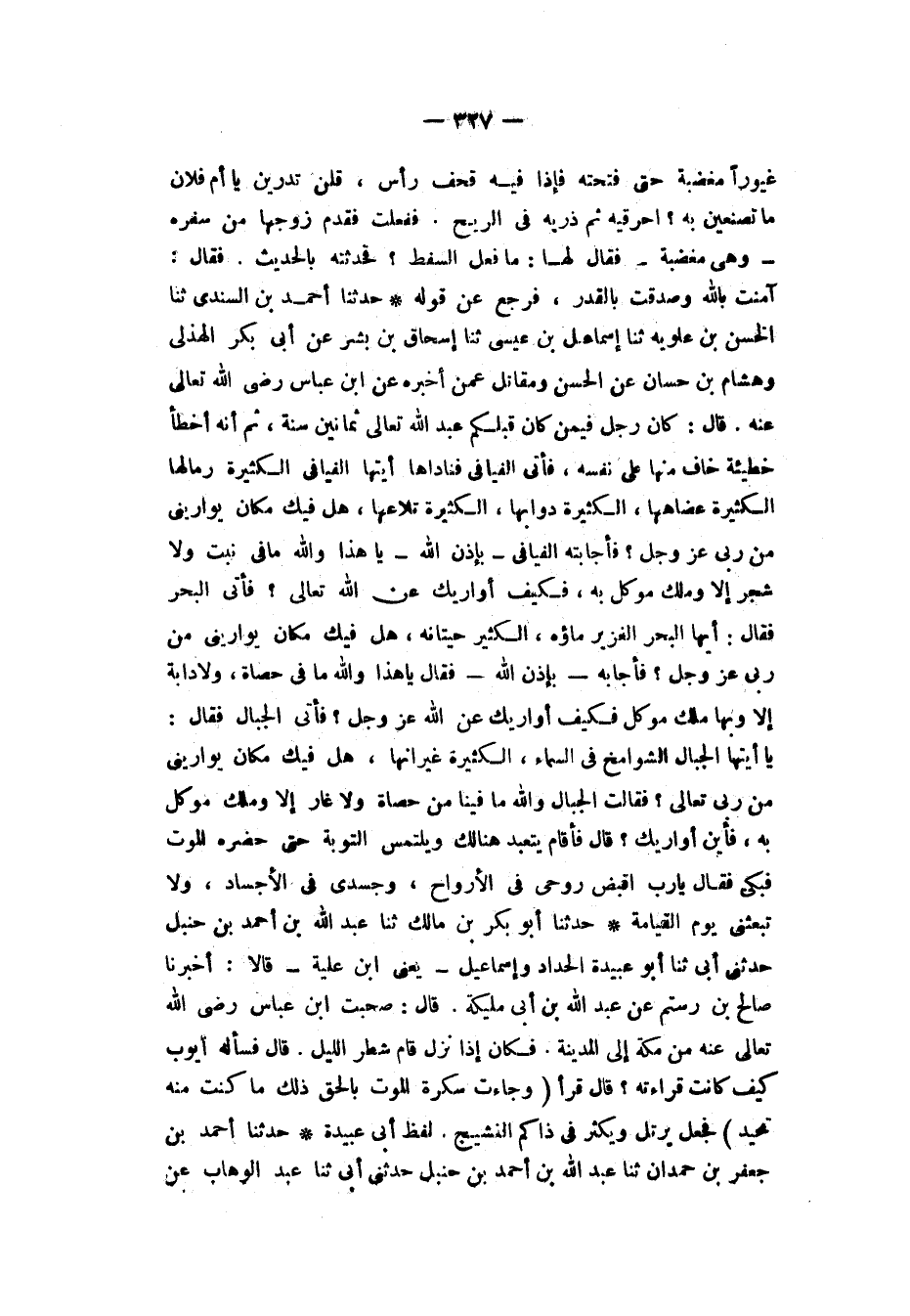 حَدَّثَنَا أَحْمَدُ بْنُ السِّنْدِيِّ، ثَنَا الْحَسَنُ بْنُ عُلُّويَةَ، ثَنَا إِسْمَاعِيلُ بْنُ عِيسَى، ثَنَا إِسْحَاقُ بْنُ بِشْرٍ، عَنْ أَبِي بَكْرٍ الْهُذَلِيِّ، وَهِشَامِ بْنِ حَسَّانَ، عَنِ الْحَسَنِ وَمُقَاتِلٍ، عَمَّنْ أَخْبَرَهُ، عَنِ ابْنِ عَبَّاسٍ، رَضِيَ اللهُ تَعَالَى عَنْهُ قَالَ: كَانَ رَجُلٌ فِيمَنْ كَانَ قَبْلَكُمْ عَبَدَ اللهَ تَعَالَى ثَمَانِينَ سَنَةً، ثُمَّ إِنَّهُ أَخْطَأَ خَطِيئَةً خَافَ مِنْهَا عَلَى نَفْسِهِ، فَأَتَى الْفَيَافِيَ فَنَادَاهَا: أَيَّتُهَا الْفَيَافِي الْكَثِيرَةُ رِمَالُهَا، الْكَثِيرَةُ عِضَاهُهَا، الْكَثِيرَةُ دَوَابُّهَا، الْكَثِيرَةُ قِلَاعُهَا، هَلْ فِيكِ مَكَانٌ يُوَارِينِي مِنْ رَبِّي عَزَّ وَجَلَّ؟ فَأَجَابَتْهُ الْفَيَافِي بِإِذْنِ اللهِ: يَا هَذَا، وَاللهِ مَا فِي نَبْتٍ وَلَا شَجَرٍ إِلَّا وَمَلَكٌ مُوَكَّلٌ بِهِ، فَكَيْفَ أُوَارِيكَ عَنِ اللهِ تَعَالَى؟ فَأَتَى الْبَحْرَ فَقَالَ: أَيُّهَا الْبَحْرُ الْغَزِيرُ مَاؤُهُ، الْكَثِيرُ حِيتَانُهُ، هَلْ فِيكَ مَكَانٌ يُوَارِينِي مِنْ رَبِّي عَزَّ وَجَلَّ؟ فَأَجَابَهُ بِإِذْنِ اللهِ فَقَالَ: يَا هَذَا، وَاللهِ مَا فِي حَصَاةٍ وَلَا دَابَّةٍ إِلَّا وَبِهَا مَلَكٌ مُوَكَّلٌ، فَكَيْفَ أُوَارِيكَ عَنِ اللهِ عَزَّ وَجَلَّ؟ فَأَتَى الْجِبَالَ فَقَالَ: يَا أَيَّتُهَا الْجِبَالُ الشَّوَامِخُ فِي السَّمَاءِ، الْكَثِيرَةُ غِيرَانُهَا، هَلْ فِيكِ مَكَانٌ يُوَارِينِي مِنْ رَبِّي تَعَالَى؟ فَقَالَتِ الْجِبَالُ: وَاللهِ مَا فِينَا مِنْ حَصَاةٍ وَلَا غَارٍ إِلَّا وَمَلَكٌ مُوَكَّلٌ بِهِ، فَأَيْنَ أُوَارِيكَ؟ قَالَ: فَأَقَامَ يَتَعَبَّدُ هُنَالِكَ وَيَلْتَمِسُ التَّوْبَةَ، حَتَّى حَضَرَهُ الْمَوْتُ فَبَكَى فَقَالَ: يَا رَبِّ، §اقْبِضْ رُوحِي فِي الْأَرْوَاحِ، وَجَسَدِي فِي الْأَجْسَادِ، وَلَا تَبْعَثْنِي يَوْمَ الْقِيَامَةِ "