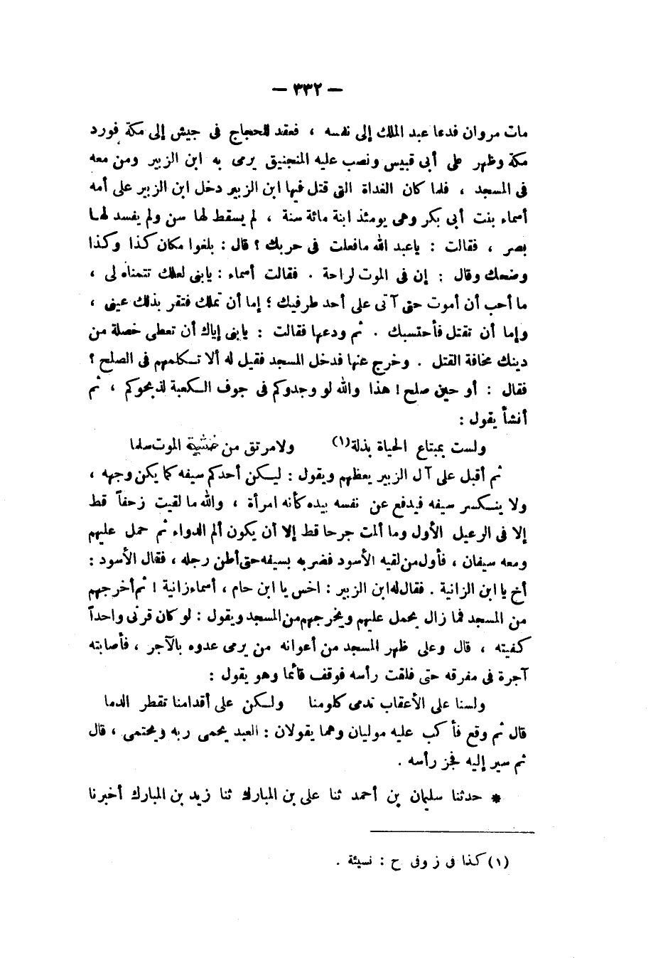 حَدَّثَنَا سُلَيْمَانُ بْنُ أَحْمَدَ، ثَنَا عَلِيُّ بْنُ الْمُبَارَكِ، ثَنَا زَيْدُ بْنُ الْمُبَارَكِ، أَخْبَرَنَا -[333]- صَاحِبٌ لَنَا أَخْبَرَنِي إِبْرَاهِيمُ بْنُ إِسْحَاقَ، قَالَ: سَمِعْتُ أَبِي إِسْحَاقَ، يَقُولُ: أَنَا حَاضِرٌ قَتْلَ ابْنِ الزُّبَيْرِ يَوْمَ قُتِلَ فِي الْمَسْجِدِ الْحَرَامِ، جَعَلَتِ الْجُيُوشُ تَدْخُلُ مِنْ أَبْوَابِ الْمَسْجِدِ، فَكُلَّمَا دَخَلَ قَوْمٌ مِنْ بَابٍ حَمَلَ عَلَيْهِمْ وَحْدَهُ حَتَّى يُخْرِجَهُمْ، فَبَيْنَا هُوَ عَلَى تِلْكَ الْحَالَةِ إِذْ جَاءَتْ شُرْفَةٌ مِنْ شُرُفَاتِ الْمَسْجِدِ فَوَقَعَتْ عَلَى رَأْسِهِ فَصَرَعَتْهُ، وَهُوَ يَتَمَثَّلُ بِهَذِهِ الْأَبْيَاتِ يَقُولُ: