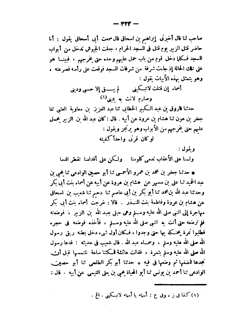 حَدَّثَنَا جَعْفَرُ بْنُ مُحَمَّدِ بْنِ عَمْرٍو الْأَحْمَسِيُّ، ثَنَا أَبُو حُصَيْنٍ الْوَادِعِيُّ، ثَنَا يَحْيَى بْنُ عَبْدِ الْحَمِيدِ، ثَنَا عَلِيُّ بْنُ مُسْهِرٍ، عَنْ هِشَامِ بْنِ عُرْوَةَ، عَنْ أَبِيهِ، عَنْ أَسْمَاءَ بِنْتِ أَبِي بَكْرٍ، وَحَدَّثَنَا عَبْدُ اللهِ بْنُ مُحَمَّدٍ، ثَنَا أَبُو بَكْرِ بْنُ أَبِي عَاصِمٍ، ثَنَا دُحَيْمٌ، ثَنَا شُعَيْبُ بْنُ إِسْحَاقَ، عَنْ هِشَامِ بْنِ عُرْوَةَ، وَفَاطِمَةَ بِنْتِ الْمُنْذِرِ، قَالَا: «خَرَجَتْ أَسْمَاءُ بِنْتُ أَبِي بَكْرٍ مُهَاجِرَةً إِلَى النَّبِيِّ صَلَّى اللهُ عَلَيْهِ وَسَلَّمَ وَهِيَ حُبْلَى بِعَبْدِ اللهِ بْنِ الزُّبَيْرِ، فَوَضَعَتْهُ فَلَمْ تُرْضِعْهُ حَتَّى أَتَتْ بِهِ النَّبِيَّ صَلَّى اللهُ عَلَيْهِ وَسَلَّمَ، فَأَخَذَهُ فَوَضَعَهُ فِي حِجْرِهِ، فَطَلَبُوا تَمْرَةً يُحَنِّكُهُ بِهَا حَتَّى وَجَدُوا، فَكَانَ §أَوَّلَ شَيْءٍ دَخَلَ بَطْنَهُ رِيقُ رَسُولِ اللهِ صَلَّى اللهُ عَلَيْهِ وَسَلَّمَ، وَسَمَّاهُ عَبْدَ اللهِ» قَالَ شُعَيْبٌ فِي حَدِيثِهِ: فَدَعَا رَسُولُ اللهِ صَلَّى اللهُ عَلَيْهِ وَسَلَّمَ بِتَمْرَةٍ، فَقَالَتْ عَائِشَةُ: فَمَكَثْنَا سَاعَةً نَلْتَمِسُهَا قَبْلَ أَنْ نَجِدَهَا فَمَضَغَهَا ثُمَّ وَضَعَهَا فِي فِيهِ