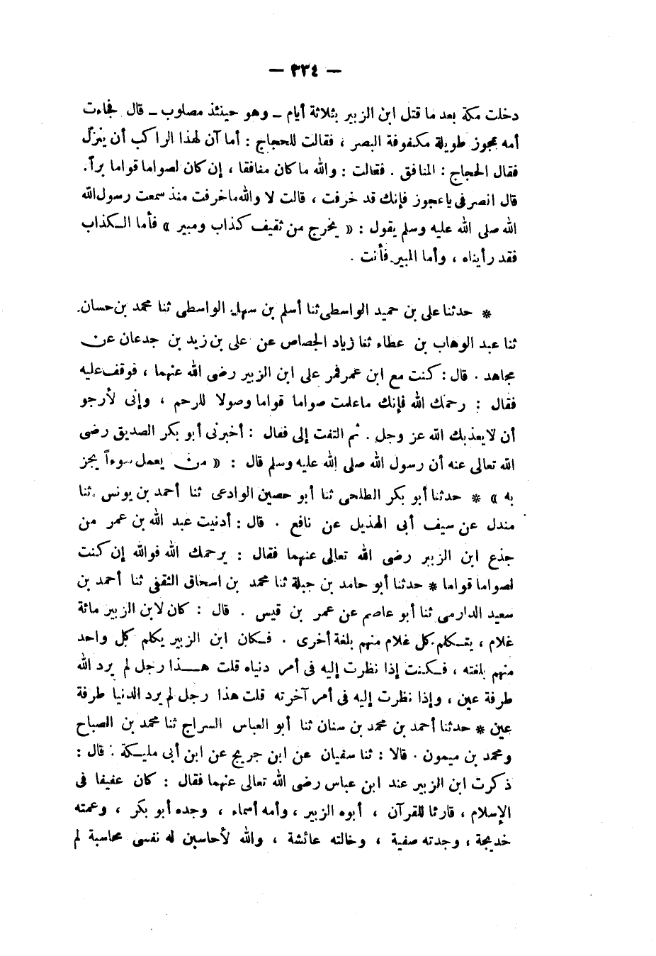 حَدَّثَنَا أَحْمَدُ بْنُ مُحَمَّدِ بْنِ سِنَانَ، ثَنَا أَبُو الْعَبَّاسِ السَّرَّاجُ، ثَنَا مُحَمَّدُ بْنُ الصَّبَّاحِ، وَمُحَمَّدُ بْنُ مَيْمُونٍ، قَالَا: ثَنَا سُفْيَانُ، عَنِ ابْنِ جُرَيْجٍ، عَنِ ابْنِ أَبِي مُلَيْكَةَ، قَالَ: ذَكَرْتُ ابْنَ الزُّبَيْرِ عِنْدَ ابْنِ عَبَّاسٍ رَضِيَ اللهُ تَعَالَى عَنْهُمَا، فَقَالَ: §كَانَ عَفِيفًا فِي الْإِسْلَامِ، قَارِئًا لِلْقُرْآنِ، أَبُوهُ الزُّبَيْرُ، وَأُمُّهُ أَسْمَاءُ، وَجَدَّهُ أَبُو بَكْرٍ، وَعَمَّتُهُ خَدِيجَةُ، وَجَدَّتُهُ صَفِيَّةُ، وَخَالَتُهُ عَائِشَةُ، وَاللهِ لَأُحَاسِبَنَّ لَهُ فِي نَفْسِي مُحَاسَبَةً لَمْ -[335]- أُحَاسِبْهَا لِأَبِي بَكْرٍ وَلَا لِعُمَرَ "