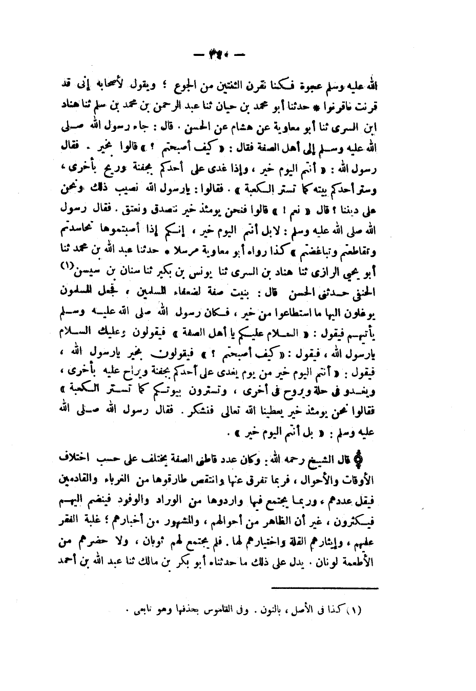 حَدَّثَنَا عَبْدُ اللهِ بْنُ مُحَمَّدٍ، ثَنَا أَبُو يَحْيَى الرَّازِيُّ، ثَنَا هَنَّادُ بْنُ السَّرِيِّ، ثَنَا يُونُسُ بْنُ بُكَيْرٍ، ثَنَا سِنَانُ بْنُ سَيْسَنَ الْحَنَفِيُّ، حَدَّثَنِي الْحَسَنُ، قَالَ: بُنِيَتْ صُفَّةٌ لِضُعَفَاءِ الْمُسْلِمِينَ، فَجَعَلَ الْمُسْلِمُونَ يُوغِلُونَ إِلَيْهَا مَا اسْتَطَاعُوا مِنْ خَيْرٍ، فَكَانَ رَسُولُ اللهِ صَلَّى اللهُ عَلَيْهِ وَسَلَّمَ يَأْتِيهِمْ فَيَقُولُ: «السَّلَامُ عَلَيْكُمْ يَا أَهْلَ الصُّفَّةِ»، فَيَقُولُونَ: وَعَلَيْكَ السَّلَامُ يَا رَسُولَ اللهِ، فَيَقُولُ: «كَيْفَ أَصْبَحْتُمْ؟» فَيَقُولُونَ: بِخَيْرٍ يَا رَسُولَ اللهِ، فَيَقُولُ: «§أَنْتُمُ الْيَوْمَ خَيْرٌ مِنْ يَوْمٍ يُغْدَى عَلَى أَحَدِكُمْ بِجَفْنَةٍ وَيُرَاحُ عَلَيْهِ بِأُخْرَى، وَيَغْدُو فِي حُلَّةٍ وَيَرُوحُ فِي أُخْرَى، وَتَسْتُرُونَ بُيُوتَكُمْ كَمَا تُسْتَرُ الْكَعْبَةُ»، فَقَالُوا: نَحْنُ يَوْمَئِذٍ خَيْرٌ، يُعْطِينَا اللهُ تَعَالَى فَنَشْكُرُ، فَقَالَ رَسُولُ اللهِ صَلَّى اللهُ عَلَيْهِ وَسَلَّمَ: «بَلْ أَنْتُمُ الْيَوْمَ خَيْرٌ» قَالَ الشَّيْخُ رَحِمَهُ اللهُ: وَكَانَ عَدَدُ قَاطِنِي الصُّفَّةِ يَخْتَلِفُ عَلَى حَسَبِ اخْتِلَافِ الْأَوْقَاتِ وَالْأَحْوَالِ، فَرُبَّمَا تَفَرَّقَ عَنْهَا، وَانْتَقَصَ طَارِقُوهَا مِنَ الْغُرَبَاءِ وَالْقَادِمِينَ فَيَقِلُّ عَدَدُهُمْ، وَرُبَّمَا يَجْتَمِعُ فِيهَا وَارِدُوهَا مِنَ الْوُرَّادِ وَالْوُفُودِ فَيَنْضَمُّ إِلَيْهِمْ فَيَكْثُرُونَ، غَيْرَ أَنَّ الظَّاهِرَ مِنْ أَحْوَالِهِمْ، وَالْمَشْهُورَ مِنْ أَخْبَارِهِمْ، غَلَبَةُ الْفَقْرِ عَلَيْهِمْ، وَإِيثَارُهُمُ الْقِلَّةَ، وَاخْتِيَارُهُمْ لَهَا، فَلَمْ يَجْتَمِعْ لَهُمْ ثَوْبَانِ، وَلَا حَضَرَهُمْ مِنَ الْأَطْعِمَةِ لَوْنَانِ، يَدُلُّ عَلَى ذَلِكَ مَا