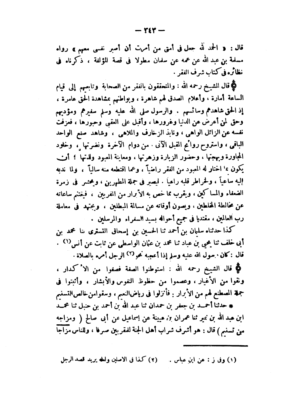 حَدَّثَنَا أَحْمَدُ بْنُ جَعْفَرِ بْنِ حَمْدَانَ، ثَنَا عَبْدُ اللهِ بْنُ أَحْمَدَ بْنِ حَنْبَلٍ، ثَنَا مُحَمَّدُ بْنُ عَبْدِ اللهِ بْنُ نُمَيْرٍ، ثَنَا عِمْرَانُ بْنُ عُيَيْنَةَ، عَنْ إِسْمَاعِيلَ، عَنْ أَبِي صَالِحٍ، " {§وَمِزَاجُهُ مِنْ تَسْنِيمٍ} [المطففين: 27]، قَالَ: «هُوَ أَشْرَفُ شَرَابِ أَهْلِ الْجَنَّةِ لِلْمُقَرَّبِينَ صَرْفًا، وَلِلنَّاسِ مِزَاجًا» -[344]- قَالَ الشَّيْخُ رَحِمَهُ اللهُ: وَأَهْلُ الصُّفَّةِ هُمْ أَخْيَارُ الْقَبَائِلِ وَالْأَقْطَارِ، أُلْبِسُوا الْأَنْوَارَ، فَاسْتَطَابُوا الْأَذْكَارَ، وَاسْتَرَاحَتْ لَهُمُ الْأَعْضَاءُ وَالْأَطْوَارُ، وَاسْتَنَارَتْ مِنْهُمُ الْبَوَاطِنُ وَالْأَسْرَارُ، بِمَا قَدَحَ فِيهَا الْمَعْبُودُ مِنَ الرِّضَا وَالْأَخْبَارِ، فَأَعْرَضُوا عَنِ الْمَشْغُوفِينَ بِمَا غَرَّهُمْ، وَلَهَوْا عَنِ الْجَامِعِينَ لِمَا ضَرَّهُمْ مِنَ الْحُطَامِ الزَّائِلِ الْبَائِدِ، وَمُسَالَمَةِ الْعَدُوِّ الْحَاسِدِ مُعْتَصِمِينَ بِمَا حَمَاهُمْ بِهِ الْوَاقِي الذَّائِدُ، فَاجْتَزَوْا مِنَ الدُّنْيَا بِالْفَلَقِ، وَمِنْ مَلْبُوسِهَا بِالْخِرَقِ، لَمْ يَعْدِلُوا إِلَى أَحَدٍ سِوَاهُ، وَلَمْ يُعَوِّلُوا إِلَّا عَلَى مَحَبَّتِهِ وَرِضَاهُ، رَغِبَتِ الْمَلَائِكَةُ فِي زِيَارَتِهِمْ وَخُلَّتِهِمْ، وَأَمَرَ الرَّسُولُ صَلَّى اللهُ عَلَيْهِ وَسَلَّمَ بِالصَّبْرِ عَلَى مُحَادَثَتِهِمْ وَمُجَالَسَتِهِمْ "