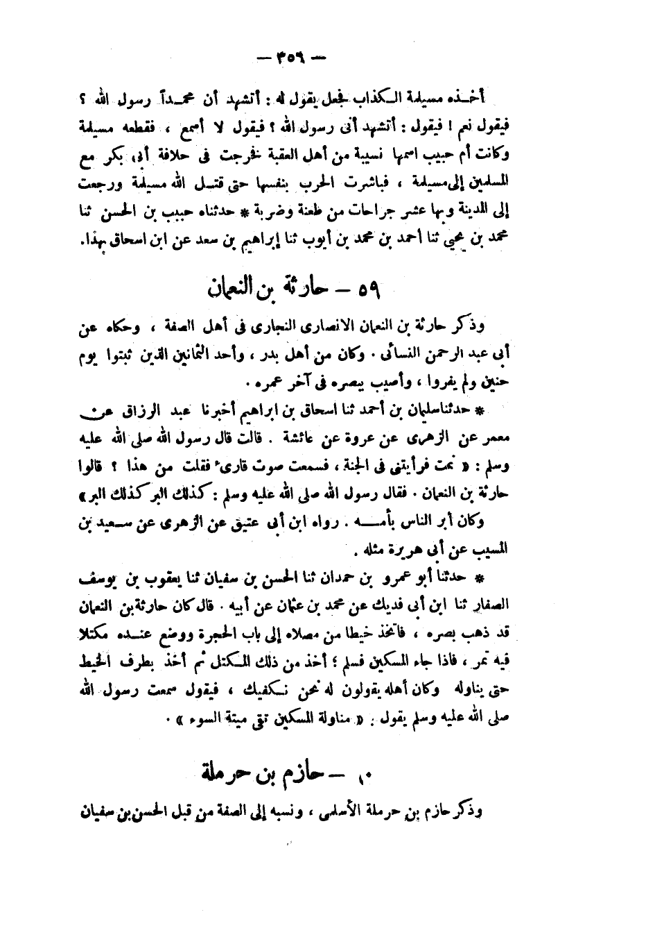 §حَارِثَةُ بْنُ النُّعْمَانَ وَذَكَرَ حَارِثَةَ بْنَ النُّعْمَانِ الْأَنْصَارِيَّ النَّجَّارِيَّ فِي أَهْلِ الصُّفَّةِ، وَحَكَاهُ عَنْ أَبِي عَبْدِ الرَّحْمَنِ النَّسَائِيِّ، وَكَانَ مِنْ أَهْلِ بَدْرٍ، وَأَحَدُ الثَّمَانِينَ الَّذِينَ ثَبَتُوا يَوْمَ حُنَيْنٍ وَلَمْ يَفِرُّوا، وَأُصِيبَ بِبَصَرِهِ فِي آخِرِ عُمْرِهِ