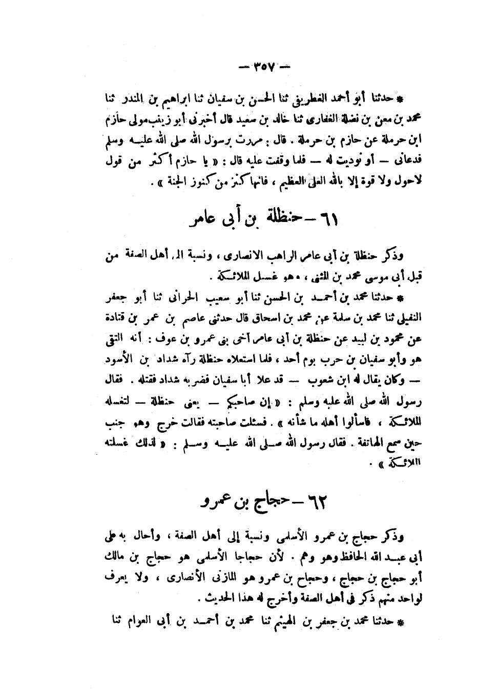 §حَنْظَلَةُ بْنُ أَبِي عَامِرٍ وَذَكَرَ حَنْظَلَةَ بْنَ أَبِي عَامِرٍ الرَّاهِبَ الْأَنْصَارِيَّ، وَنَسَبَهُ إِلَى أَهْلِ الصُّفَّةِ مِنْ قِبَلِ أَبِي مُوسَى مُحَمَّدِ بْنِ الْمُثَنَّى، وَهُوَ غَسِيلُ الْمَلَائِكَةِ