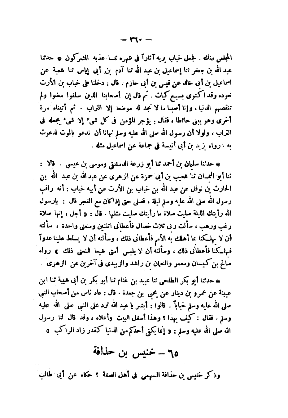 حَدَّثَنَا أَبُو بَكْرٍ الطَّلْحِيُّ، ثَنَا عُبَيْدُ بْنُ غَنَّامٍ، ثَنَا أَبُو بَكْرِ بْنُ أَبِي شَيْبَةَ، ثَنَا ابْنُ عُيَيْنَةَ، عَنْ عَمْرِو بْنِ دِينَارٍ، عَنْ يَحْيَى بْنِ جَعْدَةَ، قَالَ: " عَادَ نَاسٌ مِنْ أَصْحَابِ النَّبِيِّ صَلَّى اللهُ عَلَيْهِ وَسَلَّمَ خَبَّابًا، قَالُوا: أَبْشِرْ يَا عَبْدَ اللهِ، تَرِدُ عَلَى النَّبِيِّ صَلَّى اللهُ عَلَيْهِ وَسَلَّمَ، فَقَالَ: كَيْفَ بِهَذَا، وَهَذَا أَسْفَلُ الْبَيْتِ وَأَعْلَاهُ، وَقَدْ قَالَ لَنَا رَسُولُ اللهِ صَلَّى اللهُ عَلَيْهِ وَسَلَّمَ: «إِنَّمَا §يَكْفِي أَحَدُكُمْ مِنَ الدُّنْيَا كَقَدْرِ زَادِ الرَّاكِبِ»