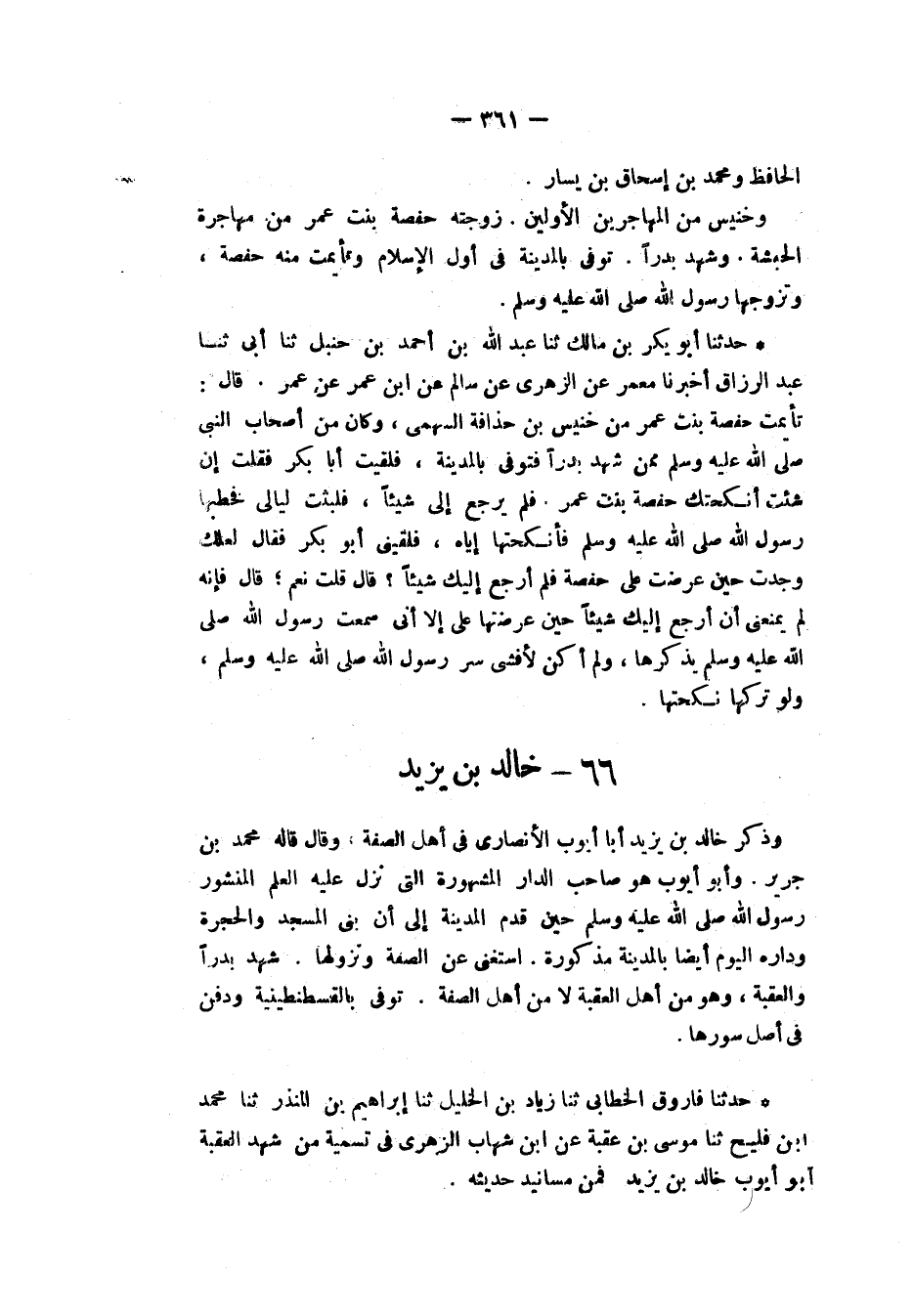 §خَالِدُ بْنُ زَيْدٍ وَذَكَرَ خَالِدَ بْنَ زَيْدٍ أَبَا أَيُّوبَ الْأَنْصَارِيَّ فِي أَهْلِ الصُّفَّةِ، وَقَالَ: قَالَهُ مُحَمَّدُ بْنُ جَرِيرٍ. وَأَبُو أَيُّوبَ هُوَ صَاحِبُ الدَّارِ الْمَشْهُوَرَةِ الَّتِي نَزَلَ عَلَيْهِ الْعَلَمُ الْمَنْشُورُ رَسُولُ اللهِ صَلَّى اللهُ عَلَيْهِ وَسَلَّمَ حِينَ قَدِمَ إِلَى الْمَدِينَةَ إِلَى أَنْ بَنَى الْمَسْجِدَ وَالْحُجْرَةَ، وَدَارُهُ الْيَوْمَ أَيْضًا بِالْمَدِينَةِ مَذْكُورَةٌ، اسْتَغْنَى عَنِ الصُّفَّةِ وَنُزُولِهَا، شَهِدَ بَدْرًا وَالْعَقَبَةَ، وَهُوَ مِنْ أَهْلِ الْعَقَبَةِ لَا مِنْ أَهْلِ الصُّفَّةِ، تُوُفِّيَ بِالْقُسْطَنْطِينِيَّةِ وَدُفِنَ فِي أَصْلِ سُورِهَا
