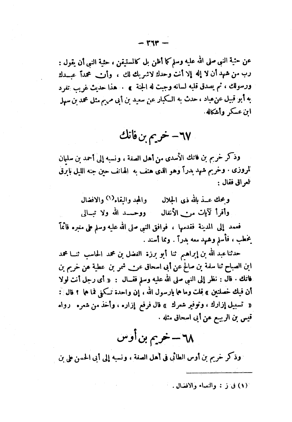§خُرَيْمُ بْنُ فَاتِكٍ وَذَكَرَ خُرَيْمَ بْنَ فَاتِكٍ الْأَسَدِيَّ مِنْ أَهْلِ الصُّفَّةِ، وَنَسَبَهُ إِلَى أَحْمَدَ بْنِ سُلَيْمَانَ الْمَرْوَزِيِّ، وَخُرَيْمٌ شَهِدَ بَدْرًا، وَهُوَ الَّذِي هَتَفَ بِهِ الْهَاتِفُ حِينَ جَنَّهُ اللَّيْلُ بِأَبْرَقِ الْعَزَّافِ فَقَالَ: