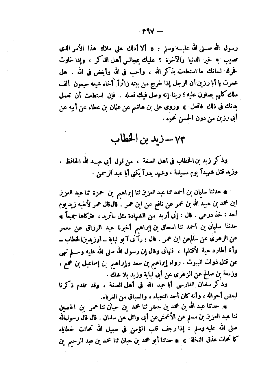 §زَيْدُ بْنُ الْخَطَّابِ وَذَكَرَ زَيْدَ بْنَ الْخَطَّابِ فِي أَهْلِ الصُّفَّةِ مِنْ قَوْلِ أَبِي عَبْدِ اللهِ الْحَافِظِ، وَزَيْدٌ قُتِلَ شَهِيدًا يَوْمَ مُسَيْلِمَةَ، وَشَهِدَ بَدْرًا، يُكَنَّى أَبَا عَبْدِ الرَّحْمَنِ