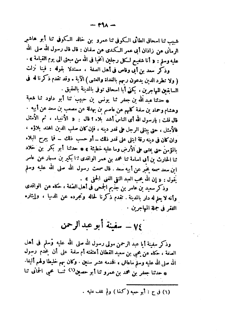 §سَفِينَةُ أَبُو عَبْدِ الرَّحْمَنِ وَذَكَرَ سَفِينَةَ أَبَا عَبْدِ الرَّحْمَنِ مَوْلَى رَسُولِ اللهِ صَلَّى اللهُ عَلَيْهِ وَسَلَّمَ فِي أَهْلِ الصُّفَّةِ، حَكَاهُ عَنْ يَحْيَى بْنِ سَعِيدٍ الْقَطَّانِ، أَعْتَقَتْهُ أُمُّ سَلَمَةَ عَلَى أَنْ يَخْدُمَ رَسُولَ اللهِ صَلَّى اللهُ عَلَيْهِ وَسَلَّمَ مَا عَاشَ، فَخَدَمَهُ عَشْرَ سِنِينَ، وَكَانَ بِهِمْ خَلِيطًا، وَلَهُمْ أَلِيفًا.