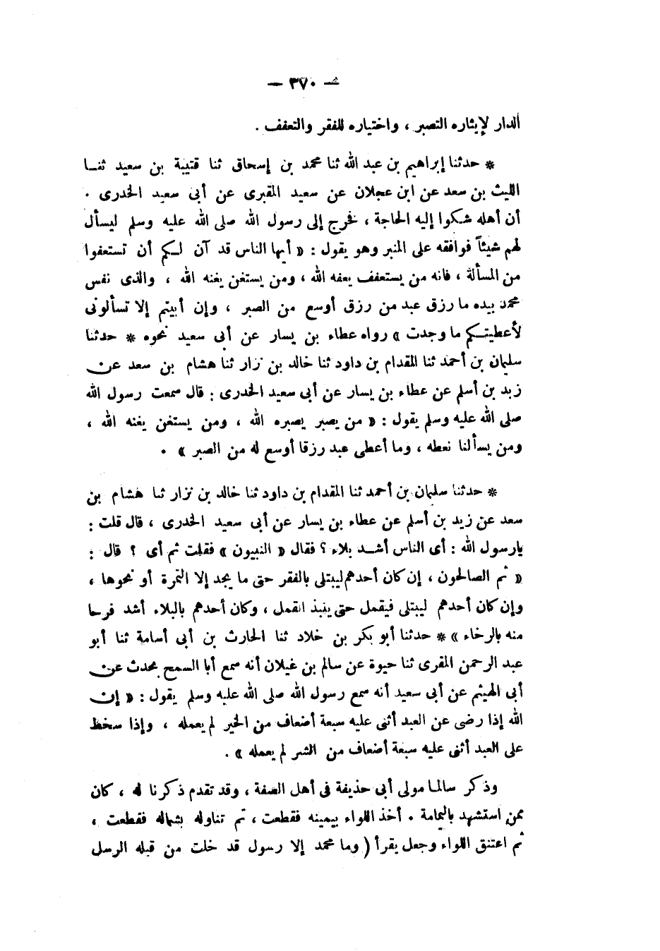 حَدَّثَنَا سُلَيْمَانُ بْنُ أَحْمَدَ، ثَنَا الْمِقْدَامُ بْنُ دَاوُدَ، ثَنَا خَالِدُ بْنُ نِزَارٍ، ثَنَا هِشَامُ بْنُ سَعْدٍ، عَنْ زَيْدِ بْنِ أَسْلَمَ، عَنْ عَطَاءِ بْنِ يَسَارٍ، عَنْ أَبِي سَعِيدٍ الْخُدْرِيِّ، قَالَ: سَمِعْتُ رَسُولَ اللهِ صَلَّى اللهُ عَلَيْهِ وَسَلَّمَ يَقُولُ: «§مَنْ يَصْبِرْ يُصَبِّرْهُ اللهُ، وَمَنْ يَسْتَغْنِ يُغْنِهِ اللهُ، وَمَنْ يَسْأَلْنَا نُعْطِهِ، وَمَا أُعْطِيَ عَبْدٌ رِزْقًا أَوْسَعَ لَهُ مِنَ الصَّبْرِ»