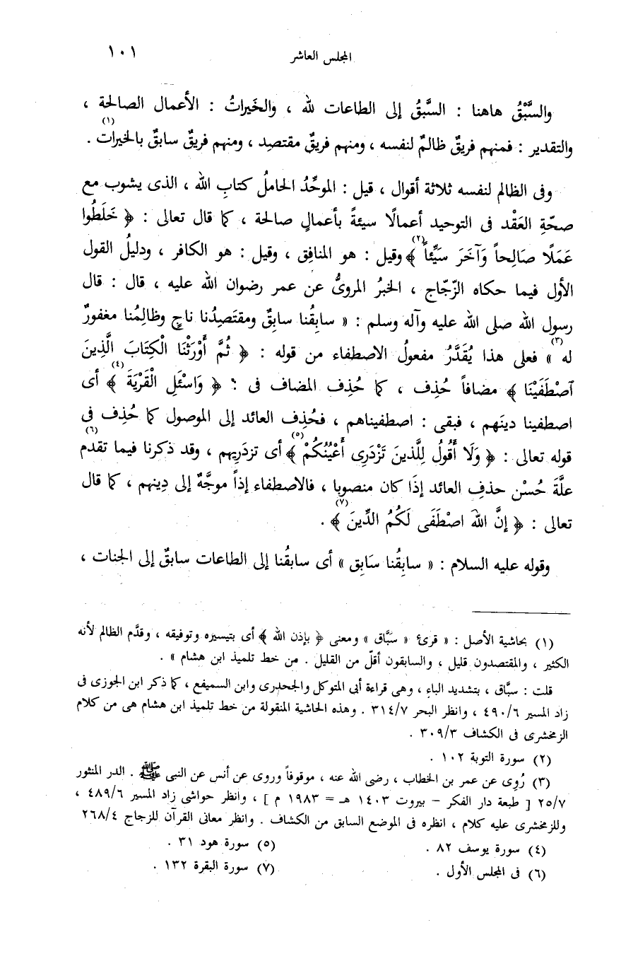 (¬1) بحاشية الأصل: «قرئ «سبّاق» ومعنى بِإِذْنِ اللهِ أى بتيسيره وتوفيقه، وقدّم الظالم لأنه الكثير، والمقتصدون قليل، والسابقون أقلّ من القليل. من خط تلميذ ابن هشام». قلت: سبّاق، بتشديد الباء، وهى قراءة أبى المتوكل والجحدرى وابن السميفع، كما ذكر ابن الجوزى فى زاد المسير 6/ 490، وانظر البحر 7/ 314. وهذه الحاشية المنقولة من خط تلميذ ابن هشام هى من كلام الزمخشرى فى الكشاف 3/ 309.