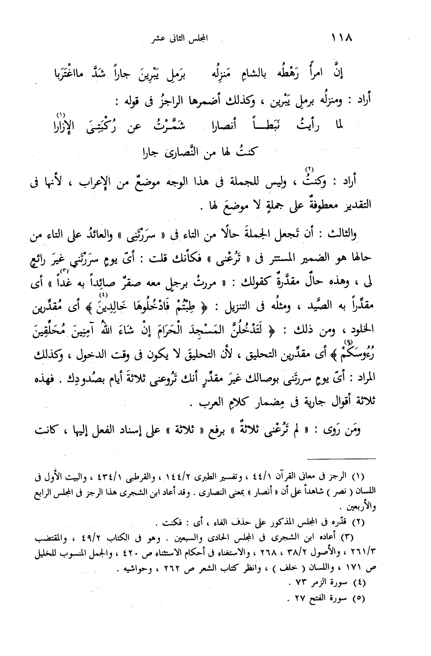 (¬1) الرجز فى معانى القرآن 1/ 44، وتفسير الطبرى 2/ 144، والقرطبى 1/ 434، والبيت الأول فى اللسان (نصر) شاهدا على أن «أنصار» بمعنى النصارى. وقد أعاد ابن الشجرى هذا الرجز فى المجلس الرابع والأربعين.