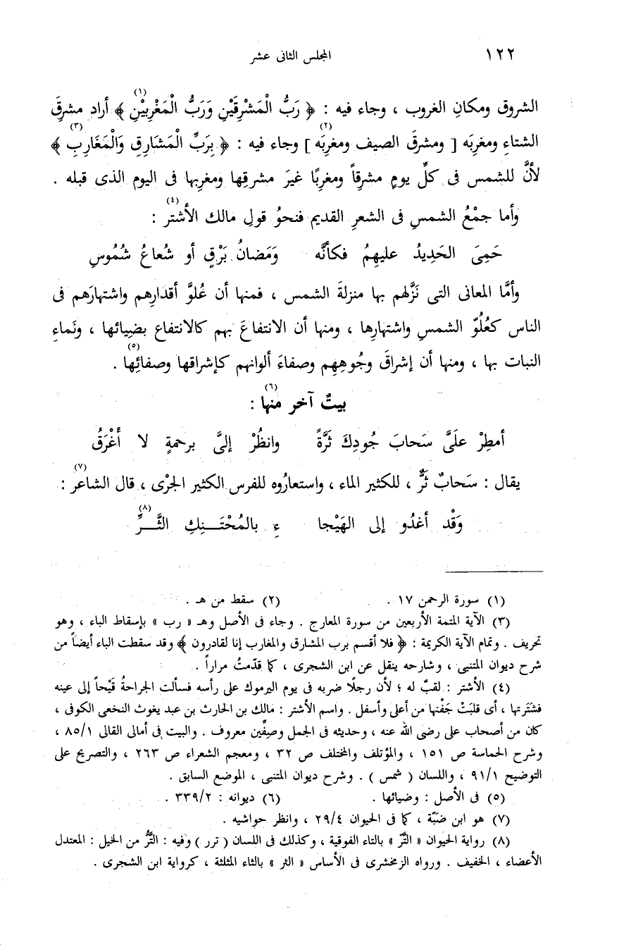 (¬3) الآية المتمة الأربعين من سورة المعارج. وجاء فى الأصل وهـ «رب» بإسقاط الباء، وهو تحريف. وتمام الآية الكريمة: فَلا أُقْسِمُ بِرَبِّ الْمَشارِقِ وَالْمَغارِبِ إِنّا لَقادِرُونَ وقد سقطت الباء أيضا من شرح ديوان المتنبى، وشارحه ينقل عن ابن الشجرى، كما قدّمت مرارا.