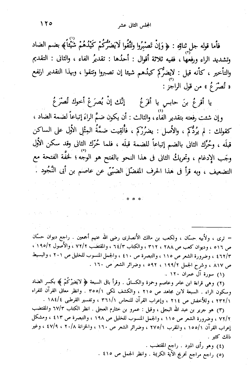 فأما قوله جل ثناؤه: {وَإِنْ تَصْبِرُوا وَتَتَّقُوا لا يَضُرُّكُمْ كَيْدُهُمْ شَيْئاً} (¬1) بضم الضاد وتشديد الراء ورفعها (¬2)، ففيه ثلاثة أقوال: أحدها: تقدير الفاء، والثانى: التقديم والتأخير، كأنه قيل: لا يضرّكم كيدهم شيئا إن تصبروا وتتقوا، وبهذا التقدير ارتفع «تصرع» من قول الراجز (¬3):
