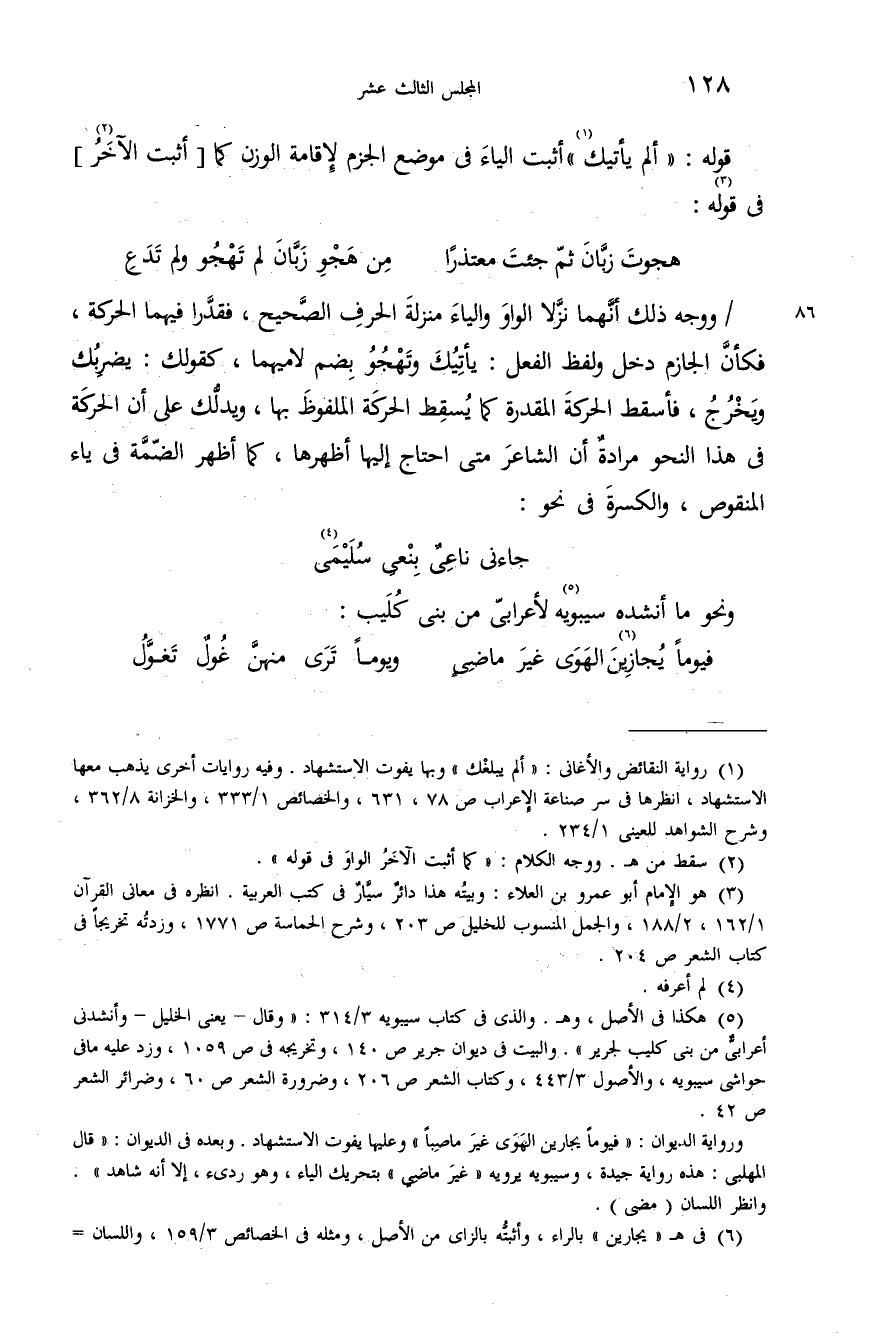 قوله: «ألم يأتيك (¬1)» أثبت الياء فى موضع الجزم لإقامة الوزن كما [أثبت الآخر (¬2)] فى قوله (¬3):