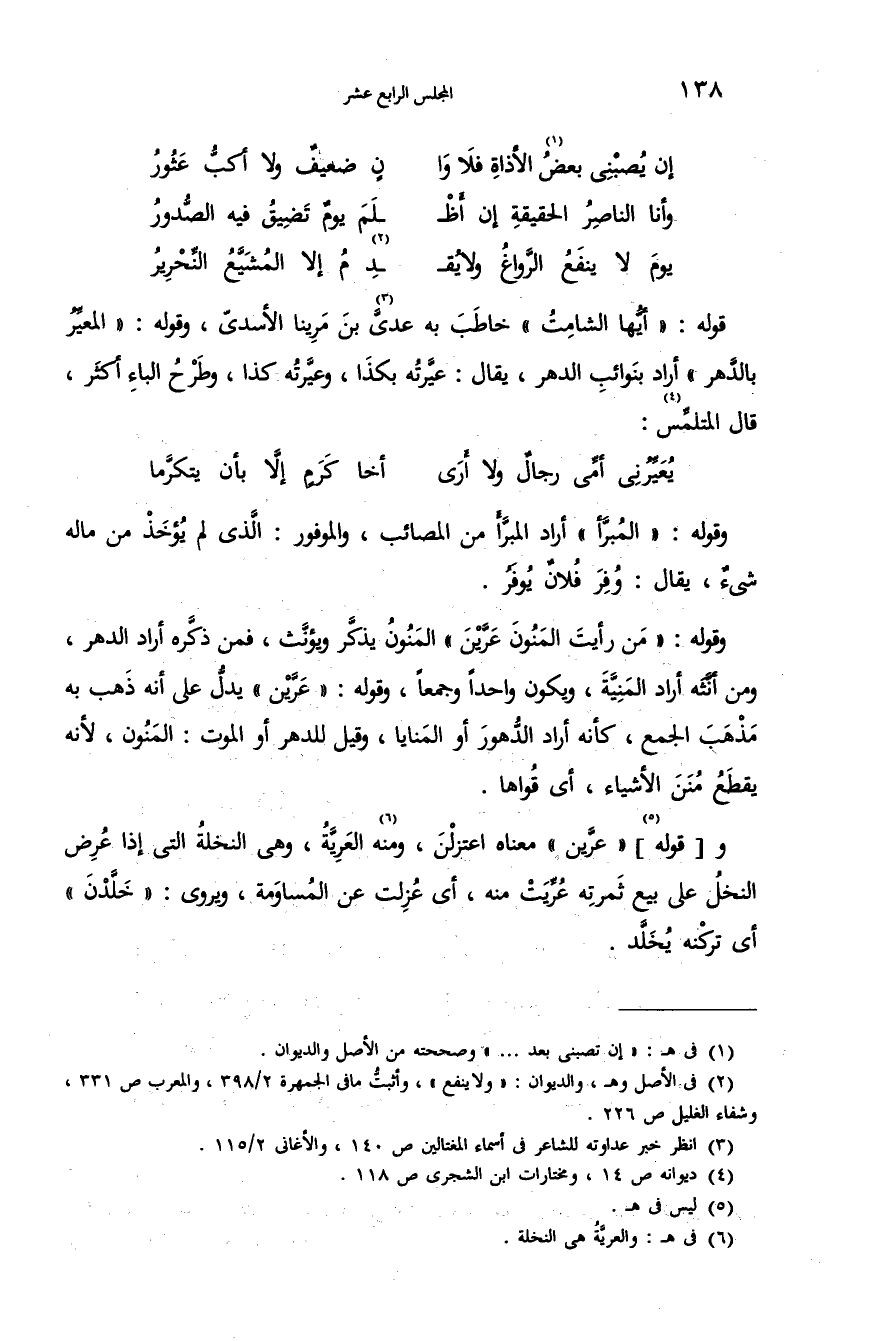 وقوله: «من رأيت المنون عرّين» المنون يذكّر ويؤنّث، فمن ذكّره أراد الدهر، ومن أنّثه أراد المنيّة، ويكون واحدا وجمعا، وقوله: «عرّين» يدلّ على أنه ذهب به مذهب الجمع، كأنه أراد الدّهور أو المنايا، وقيل للدهر أو الموت: المنون، لأنه يقطع منن الأشياء، أى قواها.