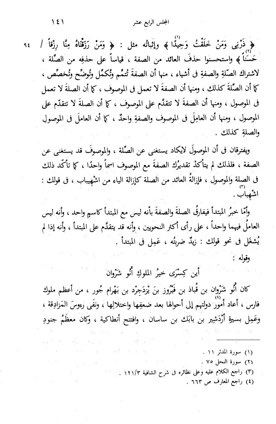 {ذَرْنِي وَمَنْ خَلَقْتُ وَحِيداً} (¬1) وإثباته مثل: {وَمَنْ رَزَقْناهُ مِنّا رِزْقاً/ حَسَناً} (¬2) واستحسنوا حذف العائد من الصفة، قياسا على حذفه من الصّلة، لاشتراك الصّلة والصفة فى أشياء، منها أن الصفة تتمّم وتكمّل وتوضّح وتخصّص، كما أن الصّلة كذلك، ومنها أن الصفة لا تعمل فى الموصوف، كما أن الصلة لا تعمل فى الموصول، ومنها أن الصفة لا تتقدّم على الموصوف، كما أن الصلة لا تتقدّم على الموصول، ومنها أن العامل فى الموصوف والصفة واحد، كما أن العامل فى الموصول والصلة كذلك.