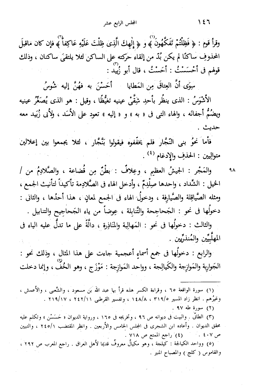 وقرأ قوم: {فَظَلْتُمْ تَفَكَّهُونَ} (¬1) و {إِلهِكَ الَّذِي ظَلْتَ عَلَيْهِ عاكِفاً} (¬2) فإن كان ما قبل المحذوف ساكنا لم يكن بدّ من إلقاء حركته على الساكن لئلا يلتقى ساكنان، وذلك قولهم فى أحسست: أحست، قال أبو زبيد (¬3):