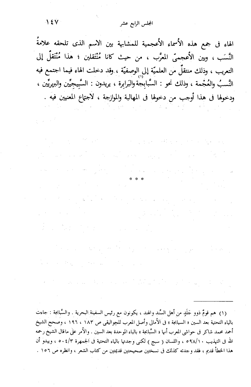 الهاء فى جمع هذه الأسماء الأعجمية للمشابهة بين الاسم الذى تلحقه علامة النّسب، وبين الأعجمىّ المعرّب، من حيث كانا منتقلين؛ هذا منتقل إلى التعريب، وذلك منتقل من العلميّة إلى الوصفيّة، وقد دخلت الهاء فيما اجتمع فيه النّسب والعجمة، وذلك نحو: السّبابجة (¬1) والبرابرة، يريدون: السّبيجيّين والبربريّين، ودخولها فى هذا أوجب من دخولها فى المهالبة والموازجة، لاجتماع المعنيين فيه.