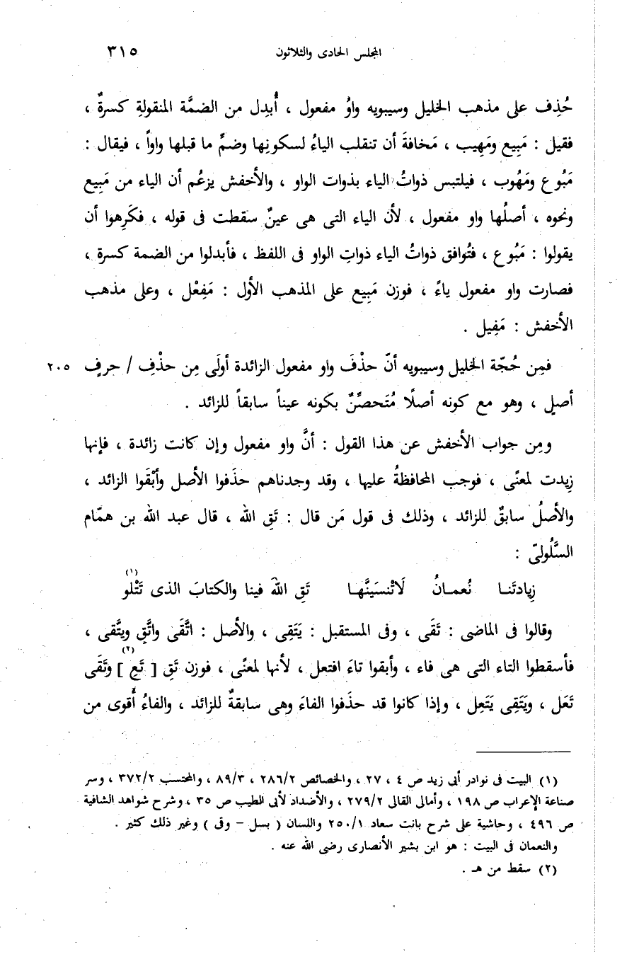 مبوع ومهوب، فيلتبس ذوات الياء بذوات الواو، والأخفش يزعم أن الياء من مبيع ونحوه، أصلها واو مفعول، لأن الياء التى هى عين سقطت فى قوله، فكرهوا أن يقولوا: مبوع، فتوافق ذوات الياء ذوات الواو فى اللفظ، فأبدلوا من الضمة كسرة، فصارت واو مفعول ياء، فوزن مبيع على المذهب الأول: مفعل، وعلى مذهب الأخفش: مفيل.
