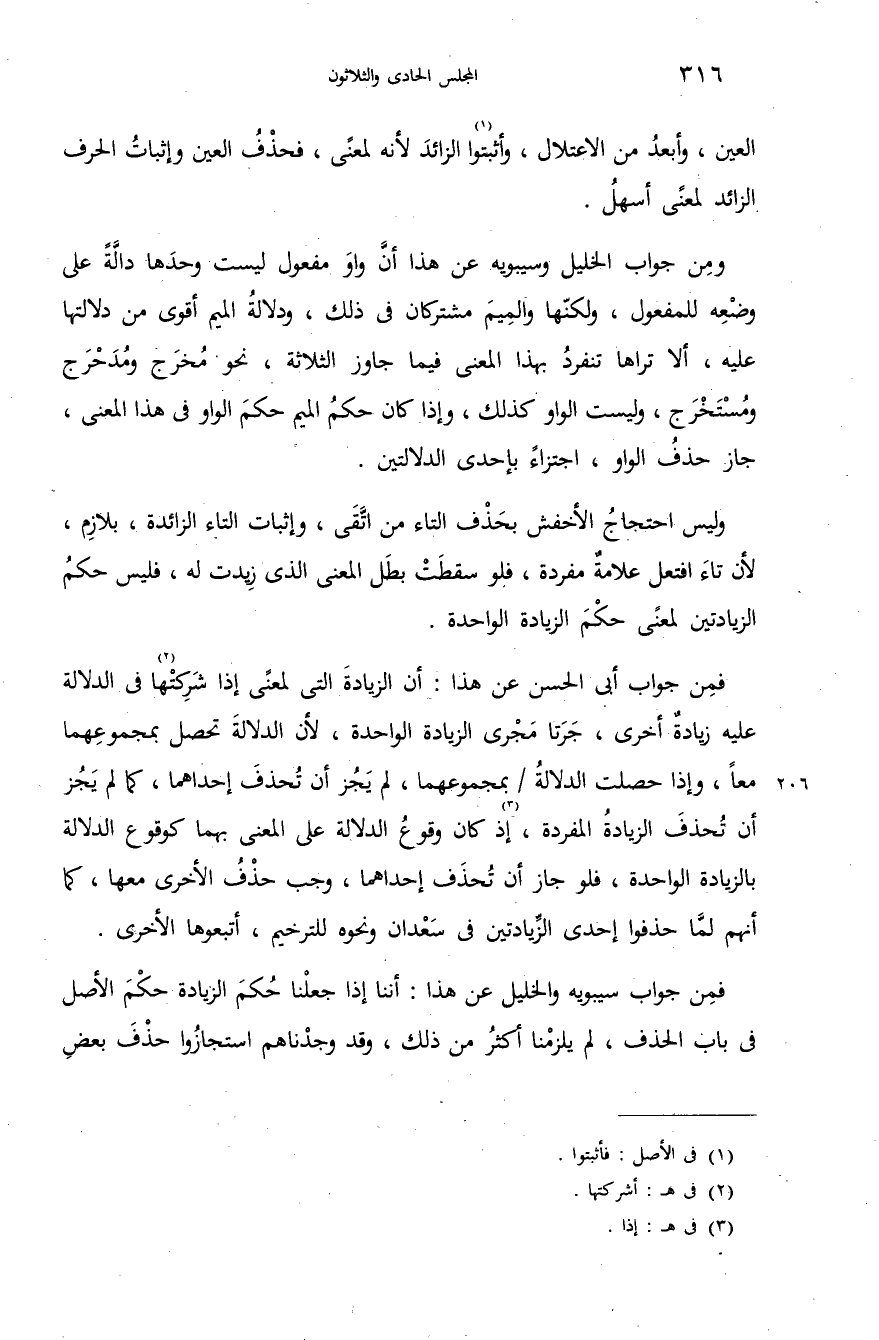 فمن جواب سيبويه والخليل عن هذا: أننا إذا جعلنا حكم الزيادة حكم الأصل فى باب الحذف، لم يلزمنا أكثر من ذلك، وقد وجدناهم استجازوا حذف بعض