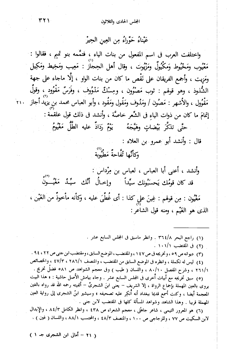 (¬5) سبق تخريجه مع أبيات أخرى فى المجلس السابع عشر. وجاء بهامش الأصل حاشية: «هذا البيت يروى بالعين المهملة بإجماع الرواة، إلا الشريف-يعنى ابن الشجرىّ-ألفيته رحمه الله قد رواه بالغين المعجمة أيضا، وكنت أسمع قديما ببغداد أنه أنكر عليه تصحيفه» وسيشير ابن الشجرى إلى رواية العين المهملة قريبا. وهذا الشاهد وشواهد المسألة كلها فى المقتضب لابن جنى.