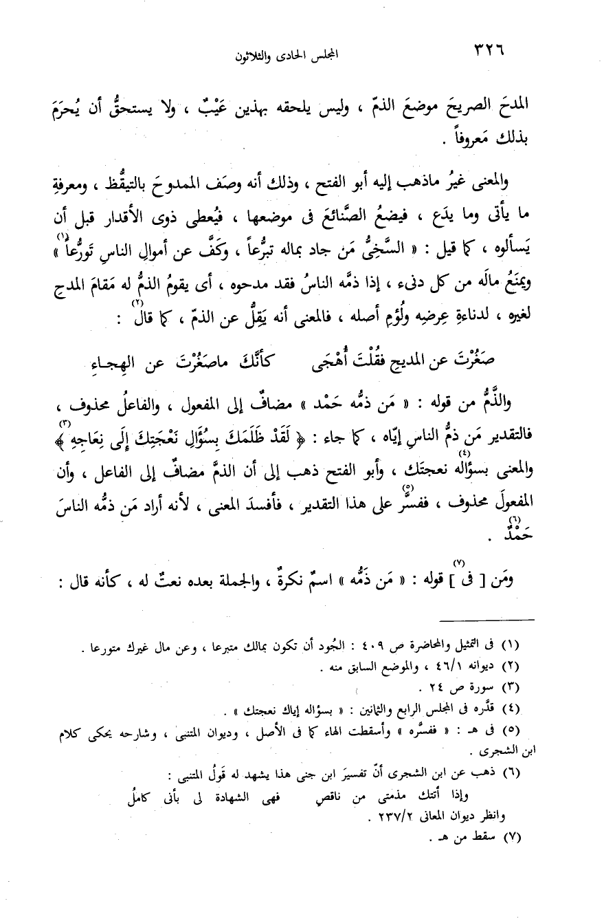(¬6) ذهب عن ابن الشجرى أنّ تفسير ابن جنى هذا يشهد له قول المتنبى: وإذا أتتك مذمتى من ناقص فهى الشهادة لى بأنى كامل وانظر ديوان المعانى 2/ 237.