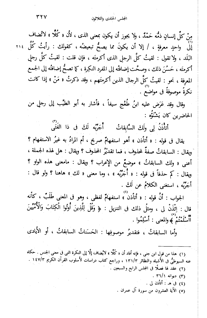 (¬1) هذا من قول ابن جنى، فإنه أفاد أن «كلاّ» لا يضاف إلاّ إلى النكرة التى فى معنى الجنس. حكاه عنه السيوطىّ فى الأشباه والنظائر 3/ 131، وراجع كتاب دراسات لأسلوب القرآن الكريم 3/ 147.