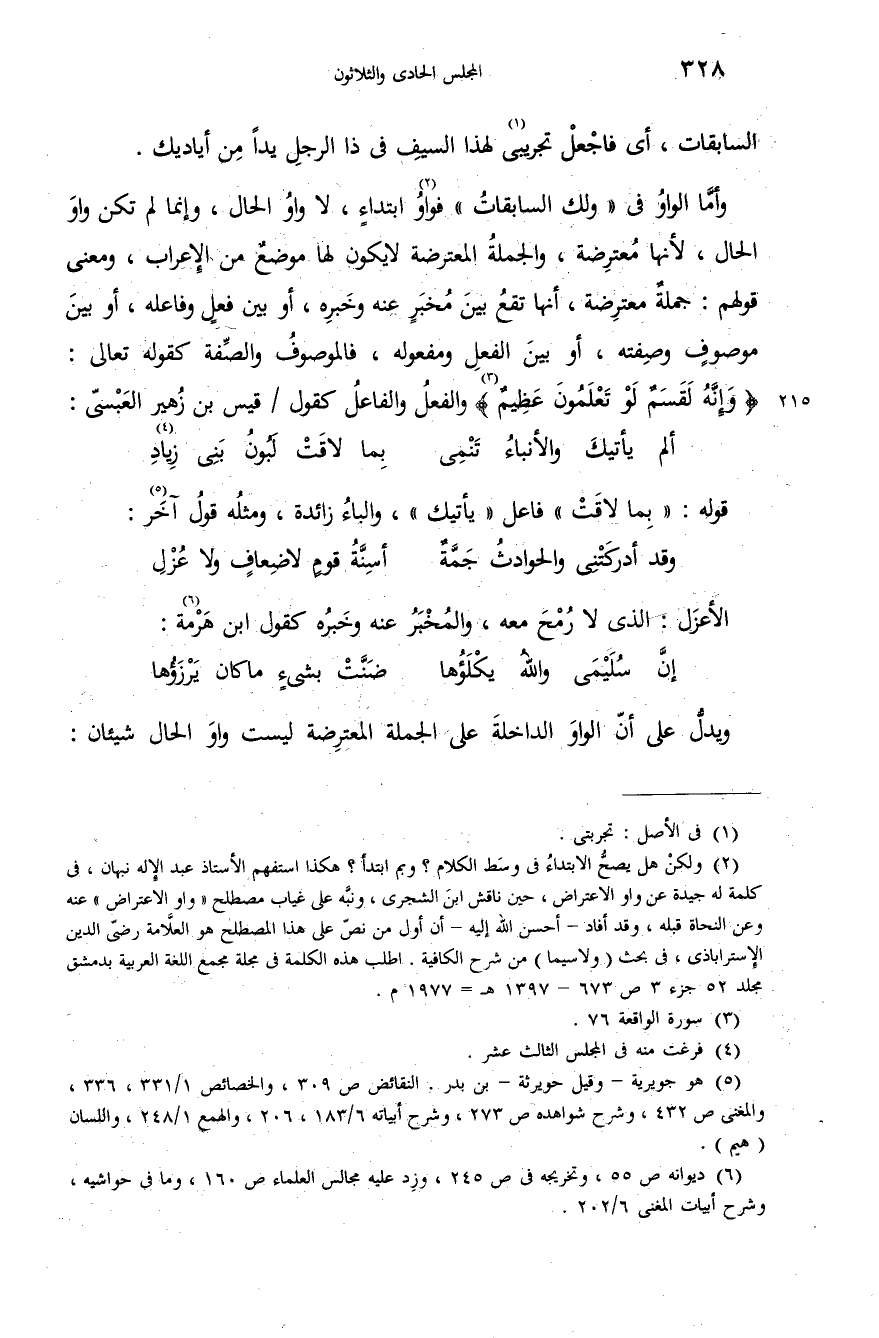 (¬2) ولكن هل يصحّ الابتداء فى وسط الكلام؟ وبم ابتدأ؟ هكذا استفهم الأستاذ عبد الإله نبهان، فى كلمة له جيدة عن واو الاعتراض، حين ناقش ابن الشجرى، ونبّه على غياب مصطلح «واو الاعتراض» عنه وعن النحاة قبله، وقد أفاد-أحسن الله إليه-أن أول من نصّ على هذا المصطلح هو العلاّمة رضيّ الدين الأسترآباذي، فى بحث (ولا سيما) من شرح الكافية. اطلب هذه الكلمة فى مجلة مجمع اللغة العربية بدمشق مجلد 52 جزء 3 ص 673 - 1397 هـ-1977 م.