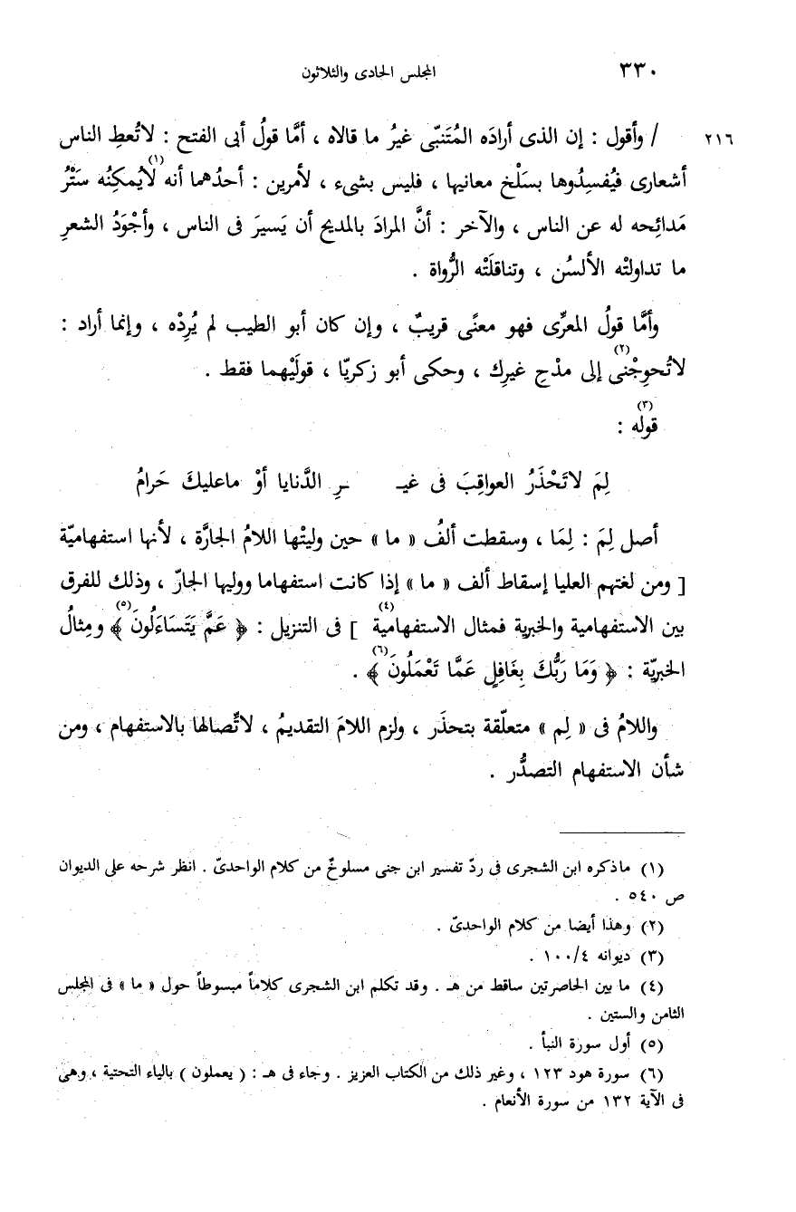 (¬1) ما ذكره ابن الشجرى فى ردّ تفسير ابن جنى مسلوخ من كلام الواحدىّ. انظر شرحه على الديوان ص 540.