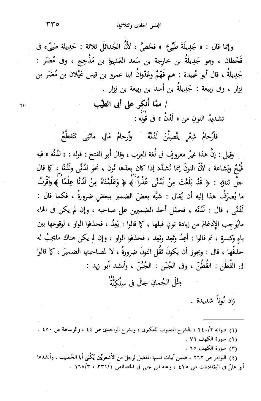 وقيل: إنّ هذا غير معروف فى لغة العرب، وقال أبو الفتح: قوله: «لدنّه» فيه قبح وبشاعة، لأنّ النون إنما تشدّد إذا كان بعدها نون، نحو لدنّى ولدنّا، كما قال جلّ ثناؤه: {قَدْ بَلَغْتَ مِنْ لَدُنِّي عُذْراً} (¬2) {وَعَلَّمْناهُ مِنْ لَدُنّا عِلْماً} (¬3) وأقرب ما يصرف هذا إليه أن يقال: شبّه بعض الضمير ببعض ضرورة، فكما قال: