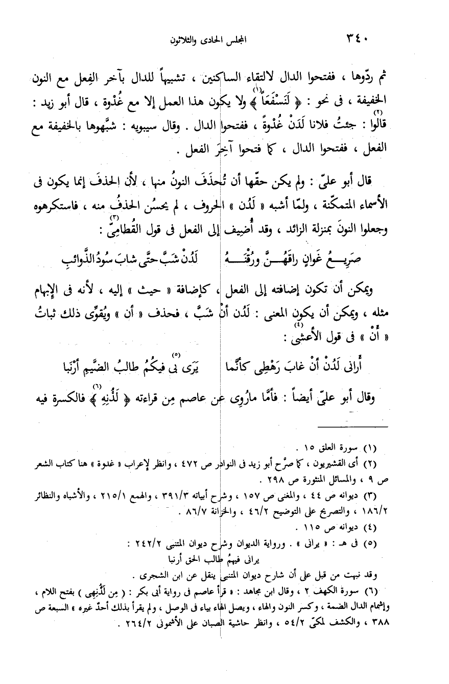 قال أبو علىّ: ولم يكن حقّها أن تحذف النون منها، لأن الحذف إنما يكون فى الأسماء المتمكّنة، ولمّا أشبه «لدن» الحروف، لم يحسن الحذف منه، فاستكرهوه وجعلوا النون بمنزلة الزائد، وقد أضيف إلى الفعل فى قول القطامىّ (¬3):