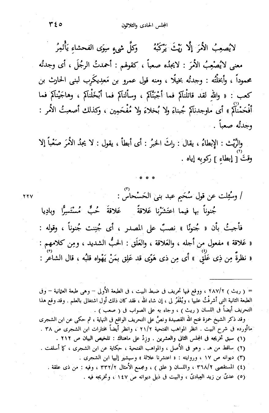 = (ريث) 2/ 287، ووقع فيها تحريف فى ضبط البيت، فى الطبعة الأولى-وهى طبعة العثمانية-وفى الطبعة الثانية التى أشرفت عليها، ويغفر لى، إن شاء الله، فقد كان ذلك أول اشتغالى بالعلم. وقد وقع هذا التحريف أيضا فى اللسان (ريث)، وجاء به على الصواب فى (صعب). وقد ذكر الشيخ حمزة فتح الله القصيدة ونصّ على التحريف الواقع فى النهاية، ثم حكى عن ابن الشجرى ما أورده فى شرح البيت. انظر المواهب الفتحية 2/ 21، وانظر أيضا مختارات ابن الشجرى ص 38.