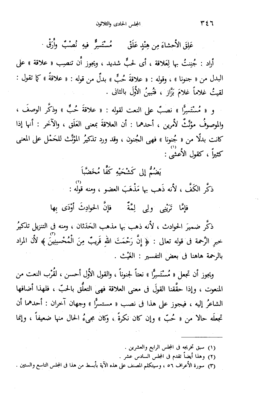 و «مستسرّا» نصب على النعت لقوله: «علاقة حبّ» وذكّر الوصف، والموصوف مؤنّث لأمرين، أحدهما: أن العلاقة بمعنى العلق، والآخر: أنها إذا كانت بدلا من «جنونا» فهى الجنون، وقد ورد تذكير المؤنّث للحمل على المعنى كثيرا، كقول الأعشى (¬1):