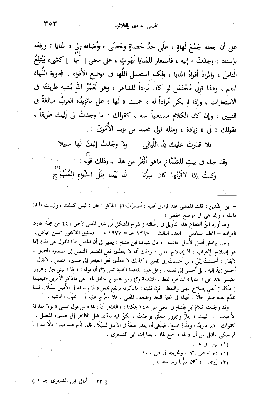 = بن رشدين: قلت للمتنبى عند قراءتى عليه: أضمرت قبل الذكر! قال: ليس كذلك، وليست المنايا فاعلة، وإنما هى فى موضع خفض». وقد أورد ابن القطاع هذا التأويل فى رسالته (شرح المشكل من شعر المتنبى) ص 241 من مجلة المورد العراقية-المجلد السادس-العدد الثالث-1397 هـ-1977 م-بتحقيق الدكتور محسن غياض. وجاء بهامش أصل الأمالى حاشية: «قال شيخنا ابن هشام: يظهر لى أن الحامل لهذا المقول على ذلك إنما هو إصلاح الإعراب، لا إصلاح المعنى، وذلك أنه لا يتعدّى فعل المضمر المتصل إلى ضميره المتصل، لا يقال: أحسنت إلىّ، بل أحسنت إلى نفسى، كذلك لا يتعدّى فعل الظاهر إلى ضميره المتصل، لا يقال: أحسن زيد إليه، بل أحسن إلى نفسه. وعلى هذه القاعدة الثانية انبنى (؟) أن قوله: «لها» ليس بجار ومجرور مضمر عائد على «المنايا» المتأخرة لفظا، المتقدمة (؟) ومن مجموع الحامل لهذا على ما ذكر الأمرين جميعهما [هكذا] أعنى إصلاح المعنى واللفظ. فإن قلت: ما ذكرته يرتفع بجعل «لها» صفة فى الأصل لسبلا، فلما تقدّم عليه صار حالا. فهذا فى غاية البعد وضعف المعنى، فلا معرّج عليه». انتهت الحاشية. وقد وجدت كلام ابن هشام فى المغنى ص 245 هكذا: «الظاهر أن «لها» من قول المتنبى «لولا مفارقة الأحباب. . . . البيت» جارّ ومجرور متعلّق بوجدت، لكن فيه تعدّى فعل الظاهر إلى ضميره المتصل، كقولك: ضربه زيد، وذلك ممتنع، فينبغى أن يقدر صفة فى الأصل لسبلا، فلما قدّم عليه صار حالاّ منه». ثم حكى ما قيل من أن «لها» جمع لهاة، بعبارات ابن الشجرى.