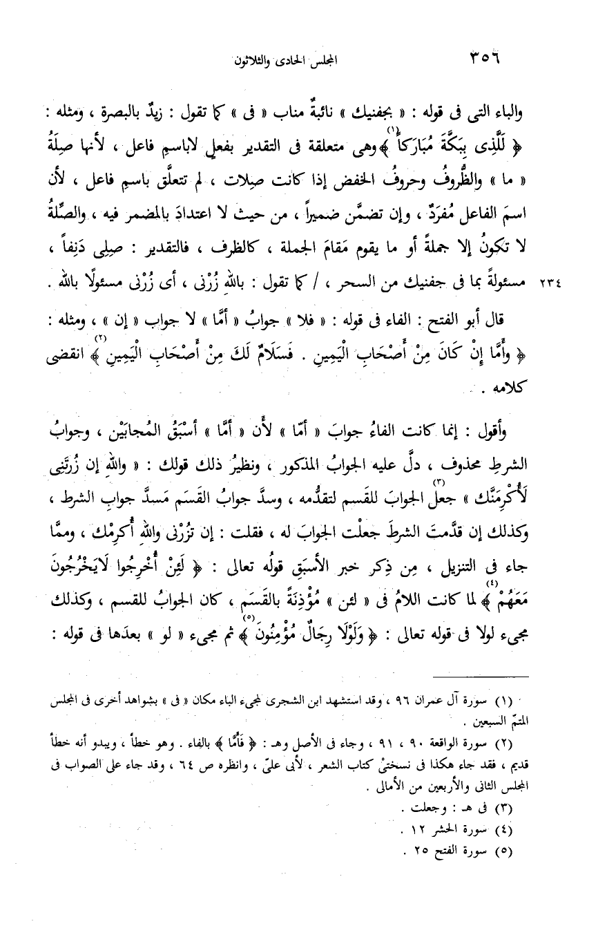 (¬2) سورة الواقعة 90،91، وجاء فى الأصل وهـ: «فأما» بالفاء. وهو خطأ، ويبدو أنه خطأ قديم، فقد جاء هكذا فى نسختى كتاب الشعر، لأبى علىّ، وانظره ص 64، وقد جاء على الصواب فى المجلس الثانى والأربعين من الأمالى.