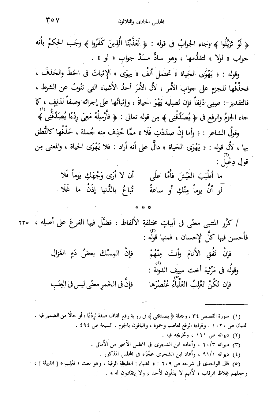 وقوله: «يهوى الحياة» تحتمل ألف «يهوى» الإثبات فى الخطّ والحذف، فحذفها للجزم على جواب الأمر، لأن الأمر أحد الأشياء التى تنوب عن الشرط، فالتقدير: صلى دنفا فإن تصليه يهو الحياة، وإثباتها على إجرائه وصفا لدنف، كما جاء الجزم والرفع فى {يُصَدِّقُنِي} من قوله تعالى: {فَأَرْسِلْهُ مَعِي رِدْءاً يُصَدِّقُنِي} (¬1)